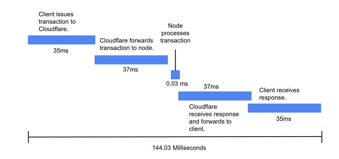 The diagram above shows the round-trip latency for a client to issue a transaction to the blockchain and receive a response. With a single API node, the entire process on average takes 144 milliseconds of which only 0.03 milliseconds is due to the AvalancheGo node processing. If you add additional API nodes for security and redundancy (recommended for production applications), the Cloudflare forwarding time will increase and further slow the system.