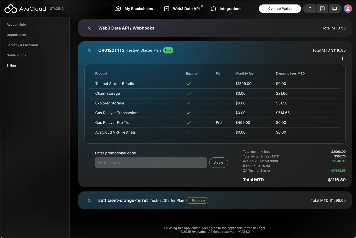 The billing dashboard categorizes information by subscription, displaying details for each Web3 Data API/Webhook and L1 subscription.