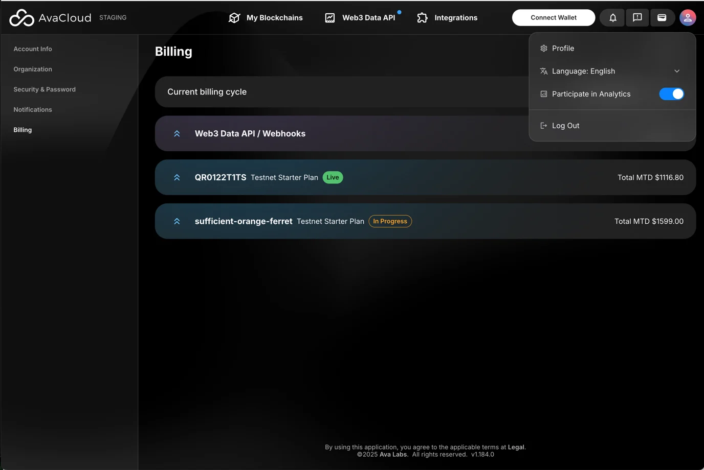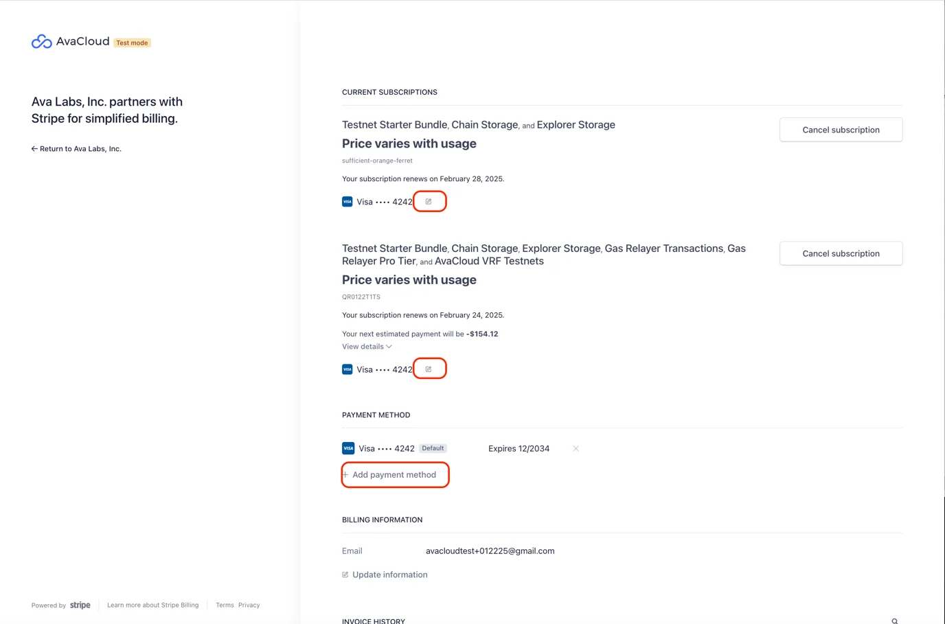 Ensure you are signed up and logged in to the AvaCloud Portal before managing billing. For registration and login instructions, refer to: How do I sign up and log in?