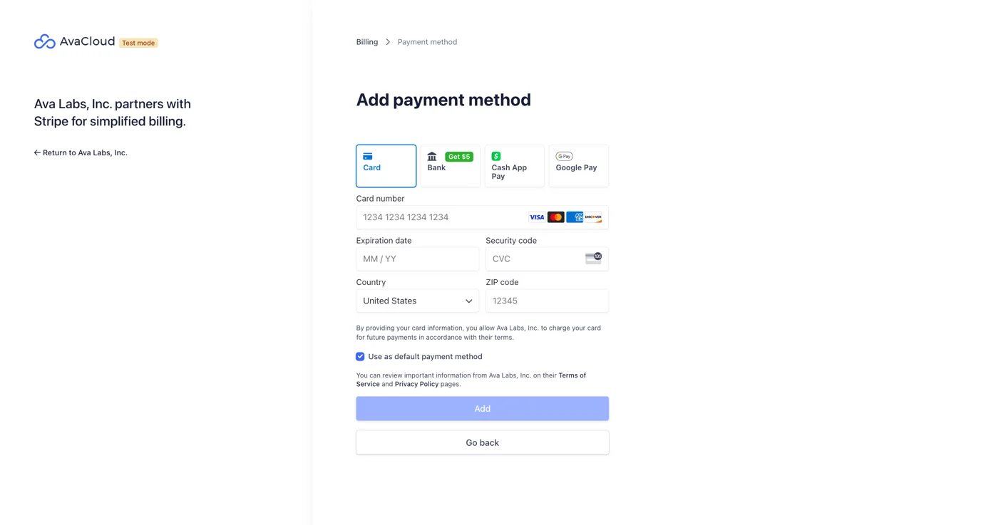 To add a new payment method, click “Add payment method” and enter your card information; you can also set this card as the default for future payments.