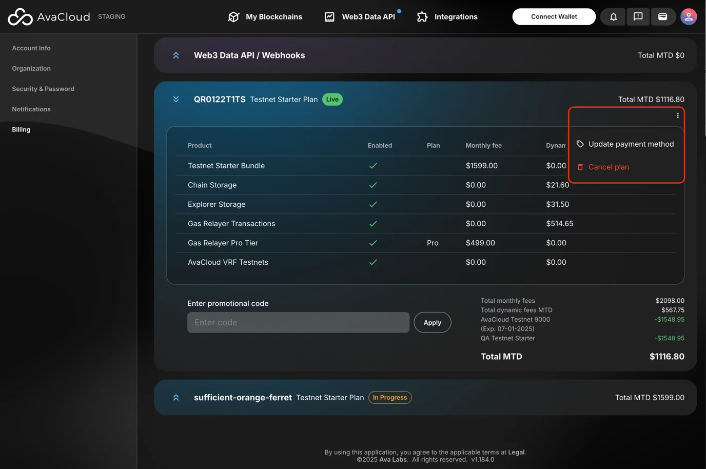 If you need to tear down an L1, you can do so by canceling the L1 subscription. Select Cancel plan from the ⋮ menu next to the corresponding L1.