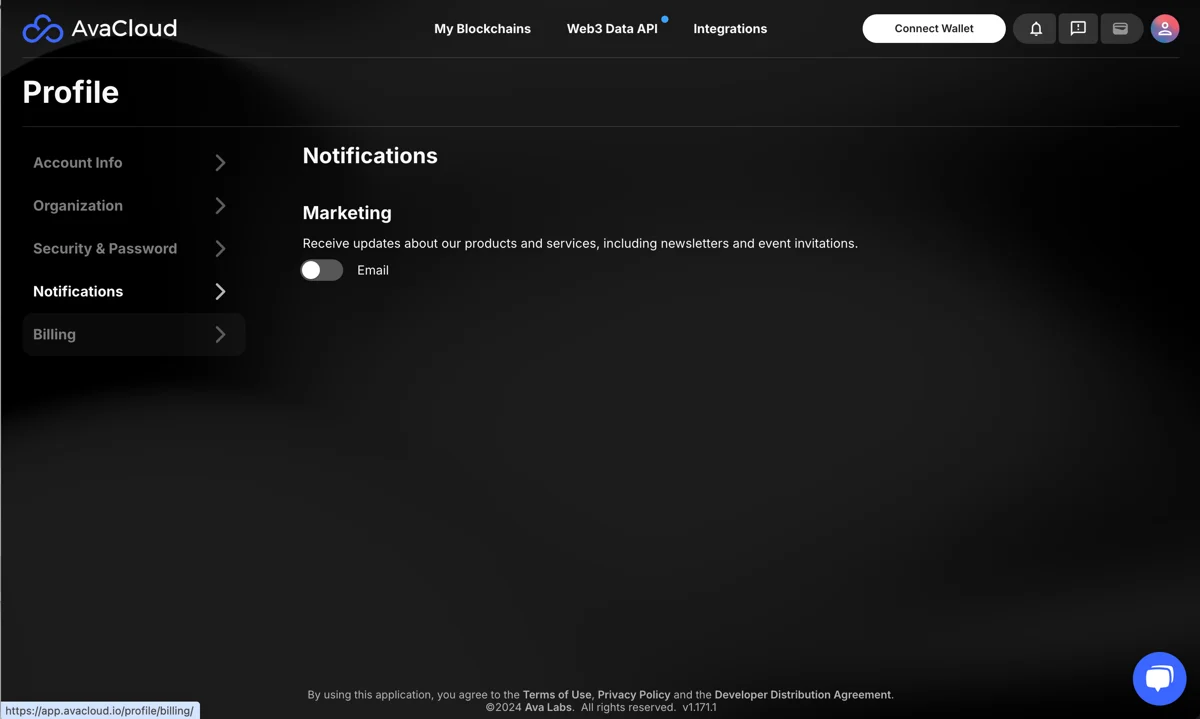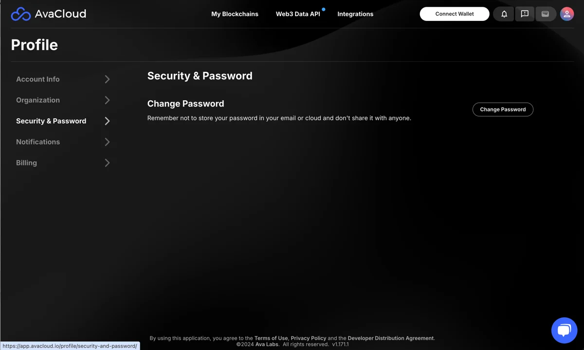 Inside the Profile section, you can manage the following areas: account info, organization details, security & password, notifications, and billing.