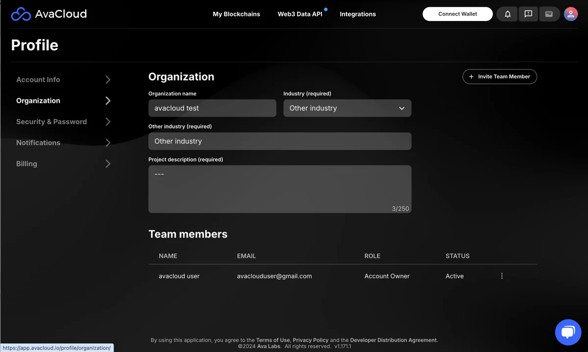In the Organization section, you can update organization details and invite other users to your organization for collaboration.