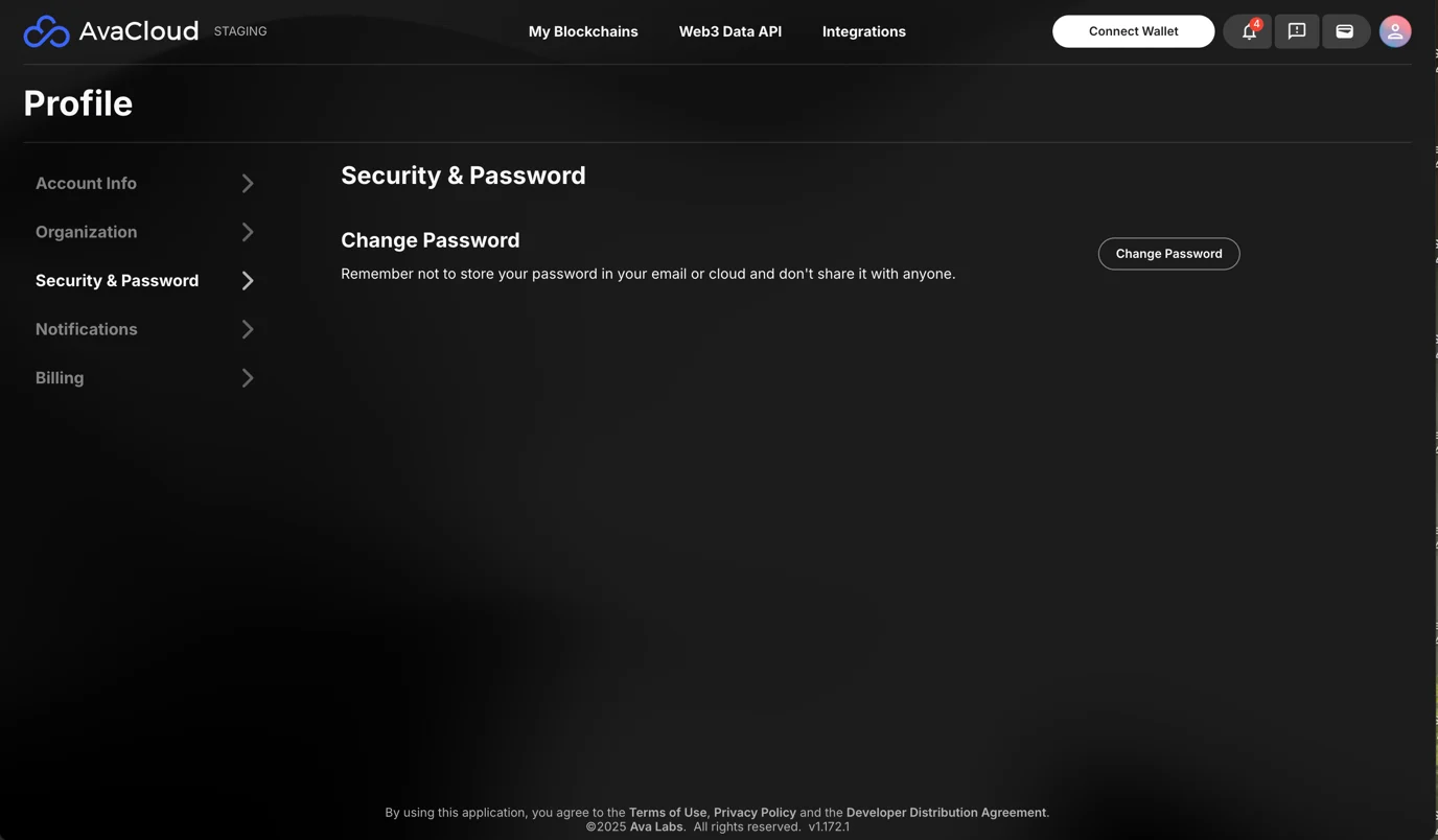 Click your profile icon and navigate to Profile → Security & Password, and follow the prompts to update your password.