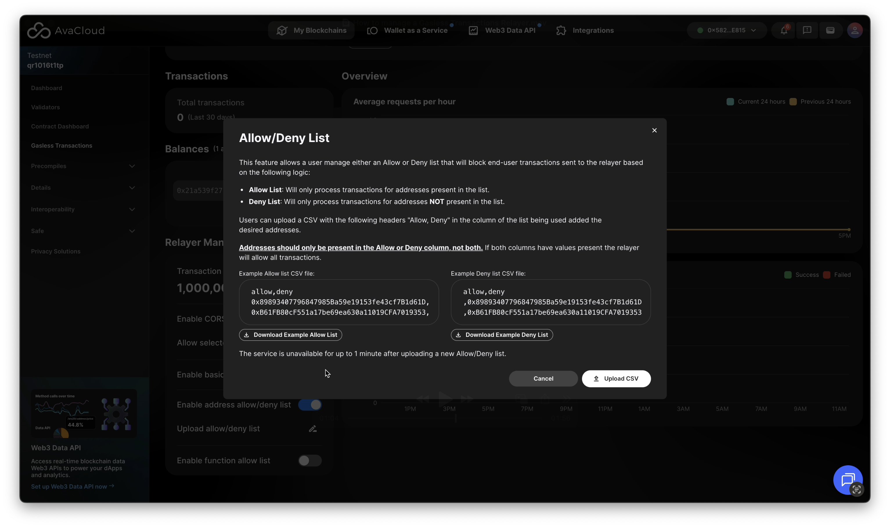 Add or upload wallet addresses to explicitly allow or deny access to your relayer, giving you granular control over which addresses can submit requests.