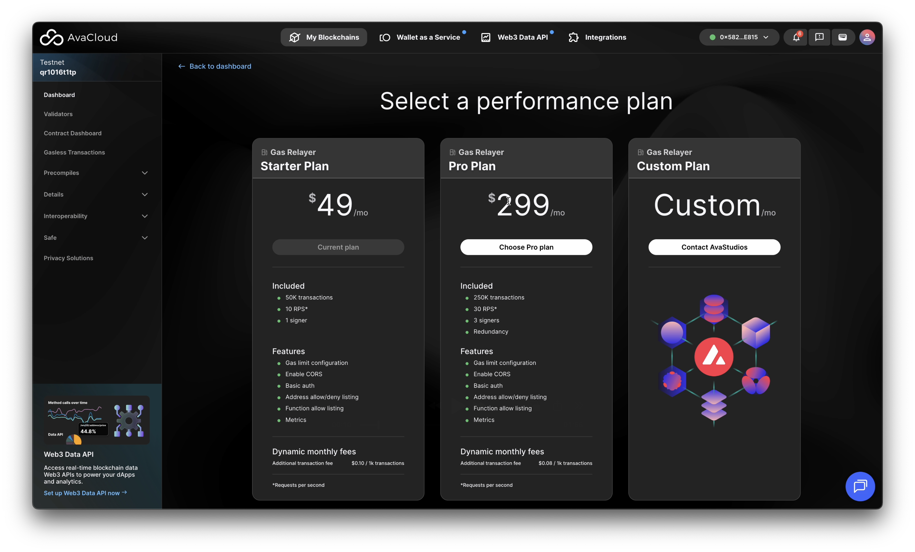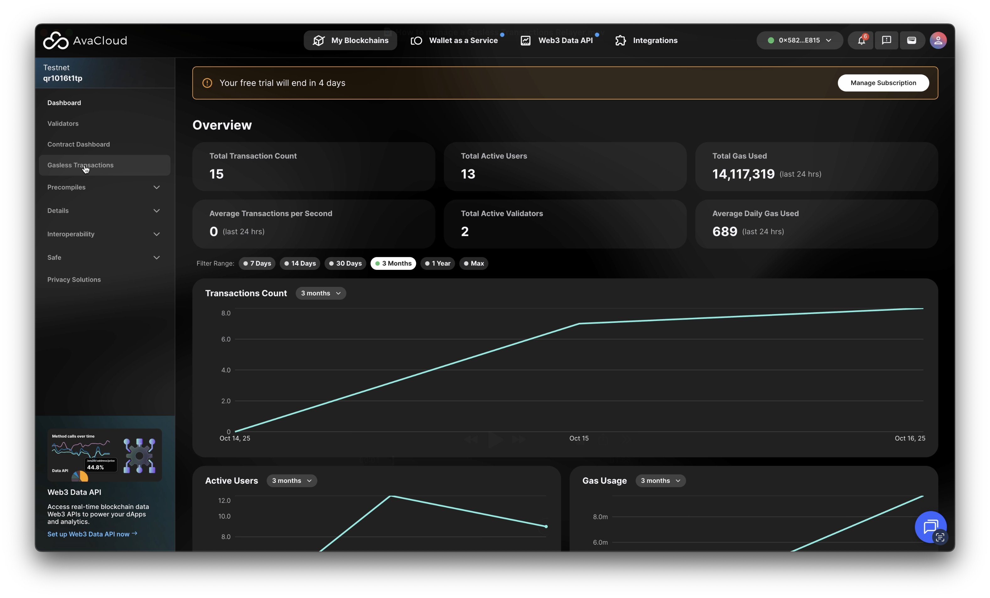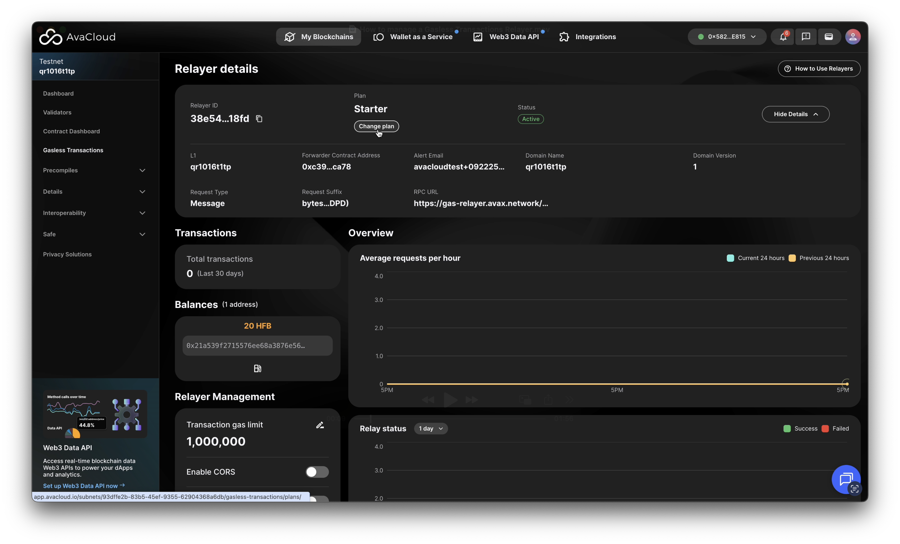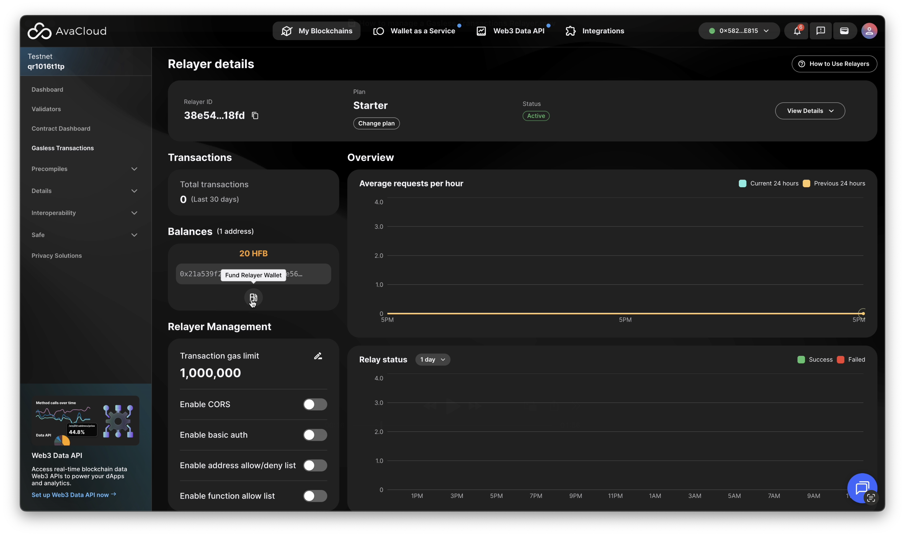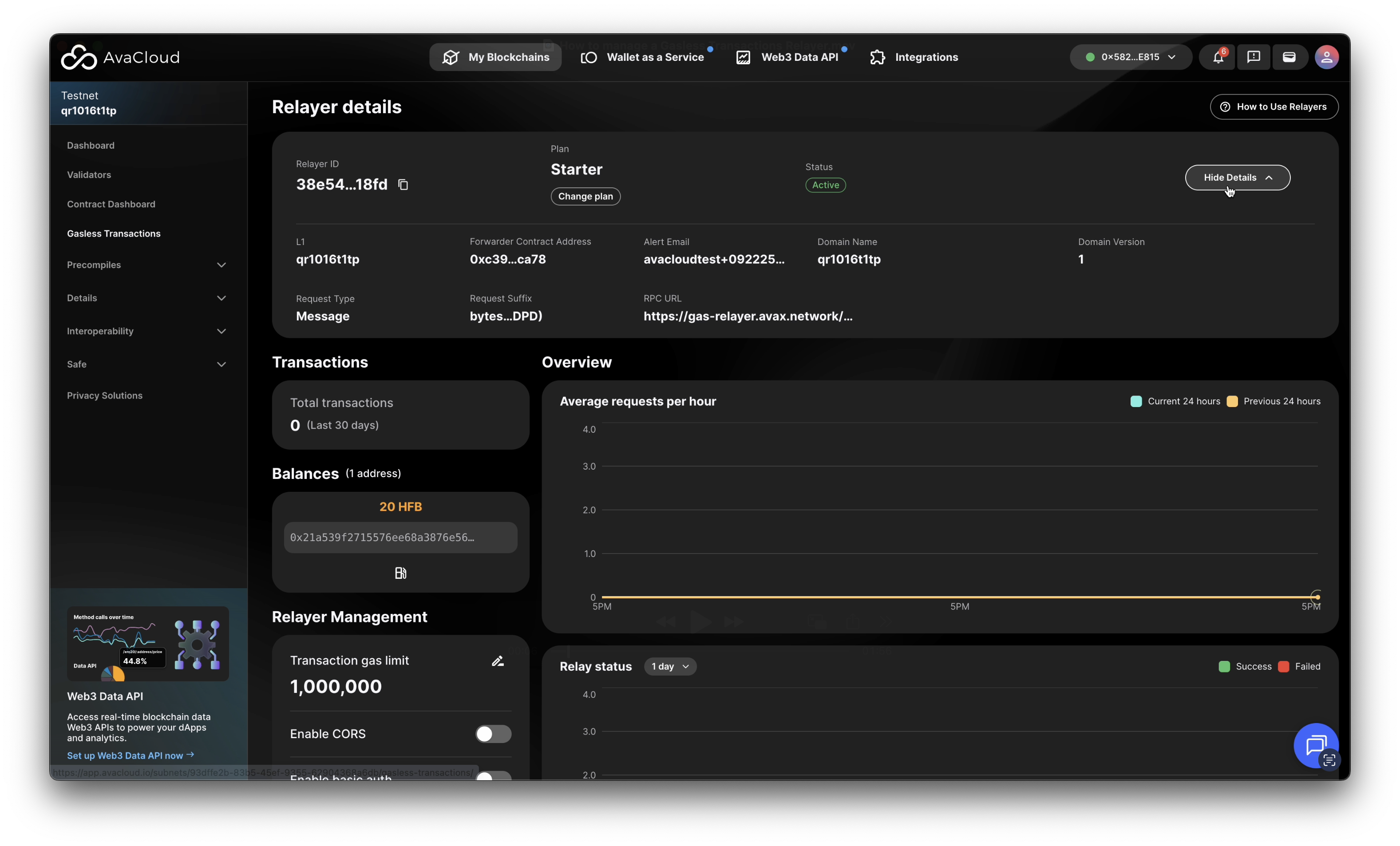 Once your Gasless Transactions Relayer is set up, you can manage and monitor it from the AvaCloud Portal. Open the Gasless Transactions tab under your desired L1 to access your relayer dashboard.