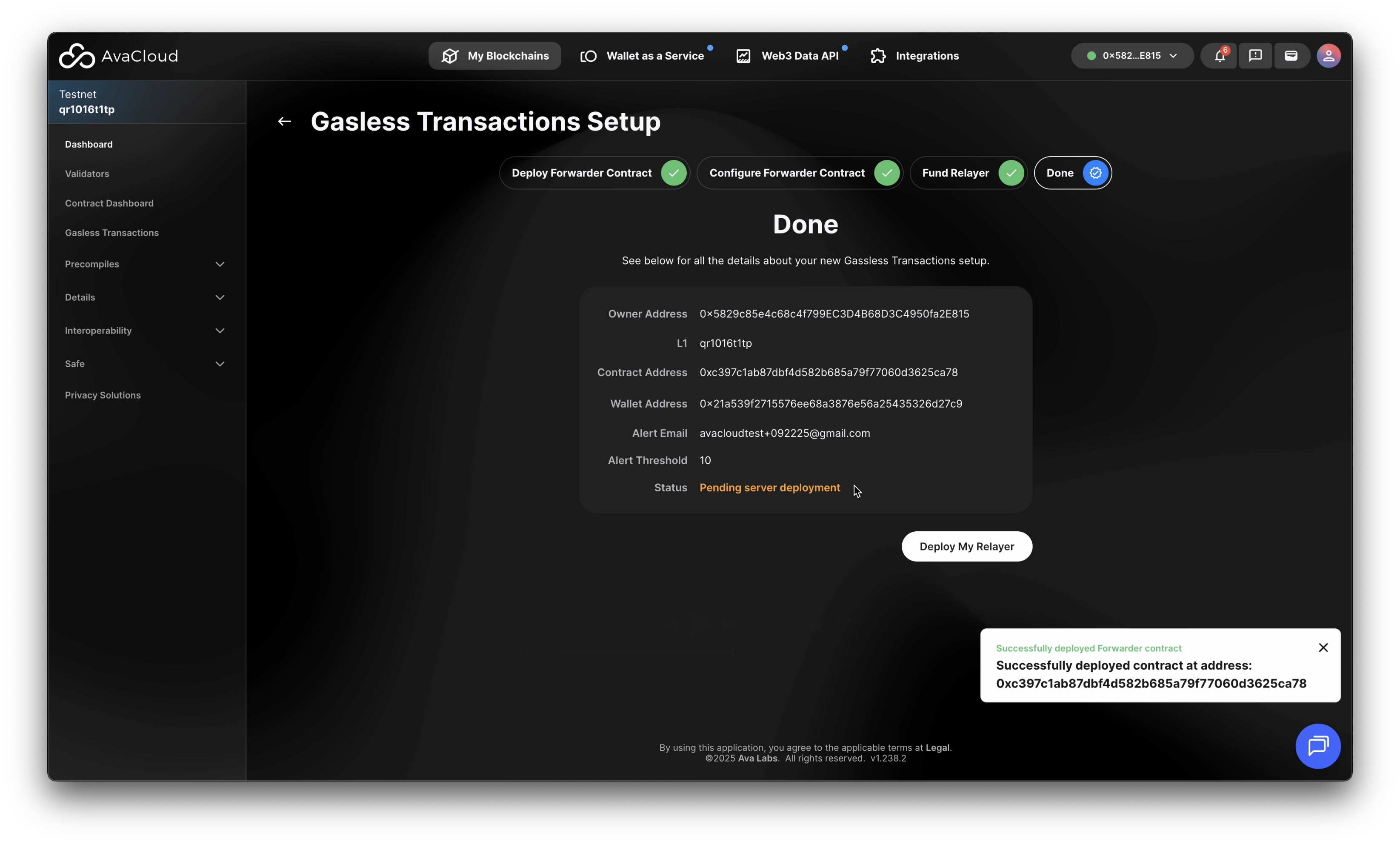 Go back to Dashboardto view your relayer dashboard. Here you’ll see the current status of your relayer, which will start asPendingduring deployment, thenActiveafter completion.