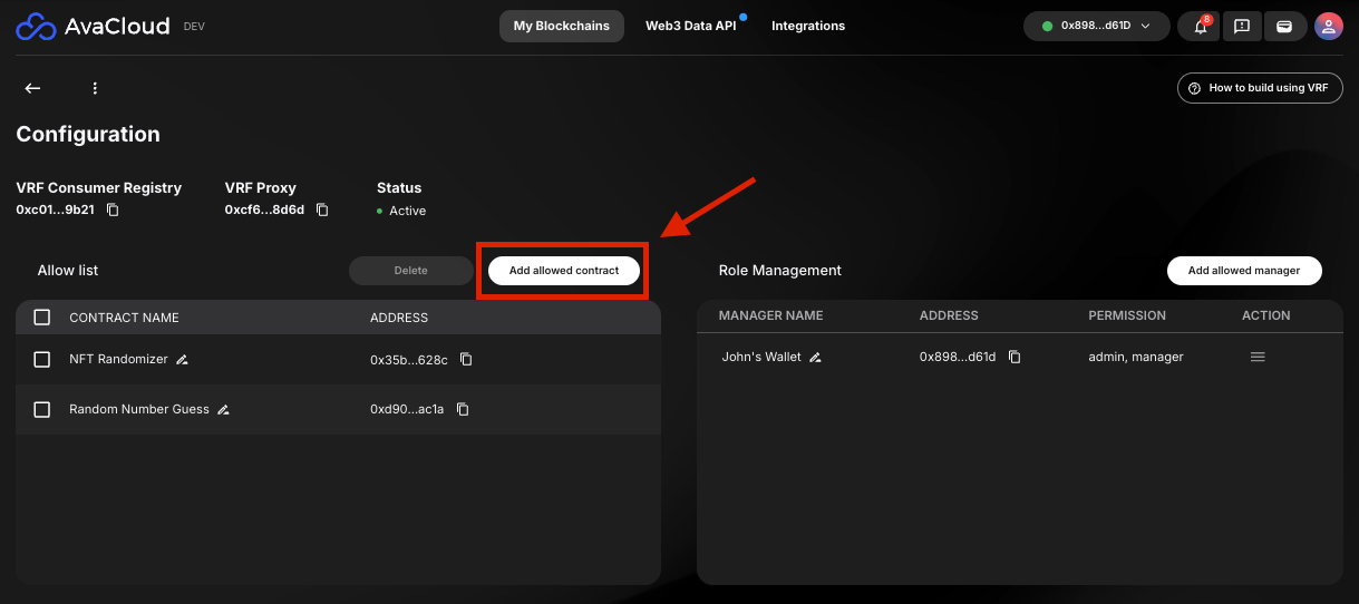 - Add the contract address to the Consumer Allowlist in the AvaCloud Portal VRF module