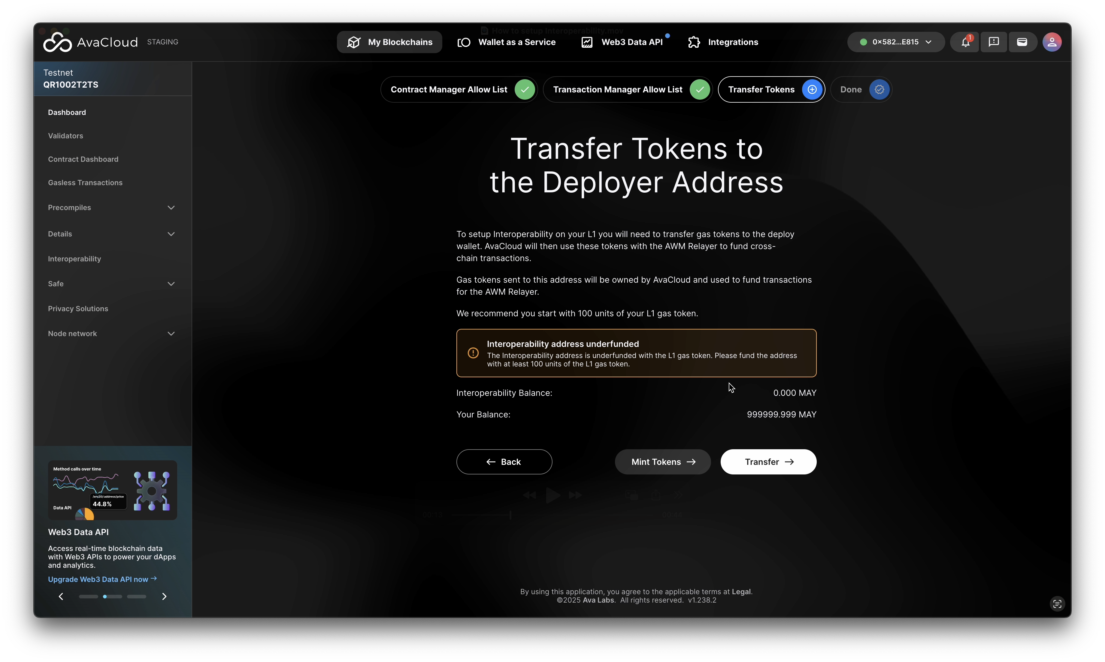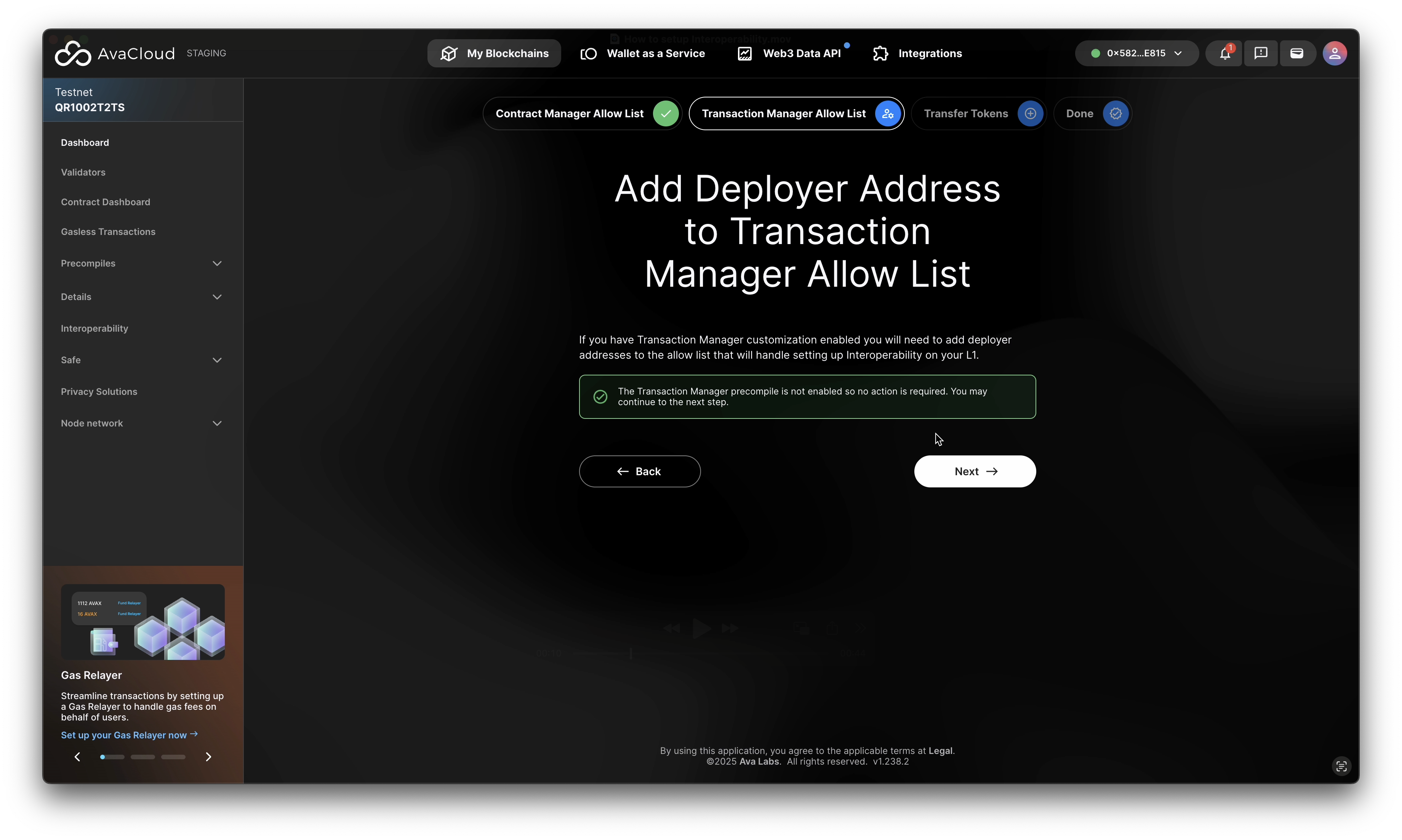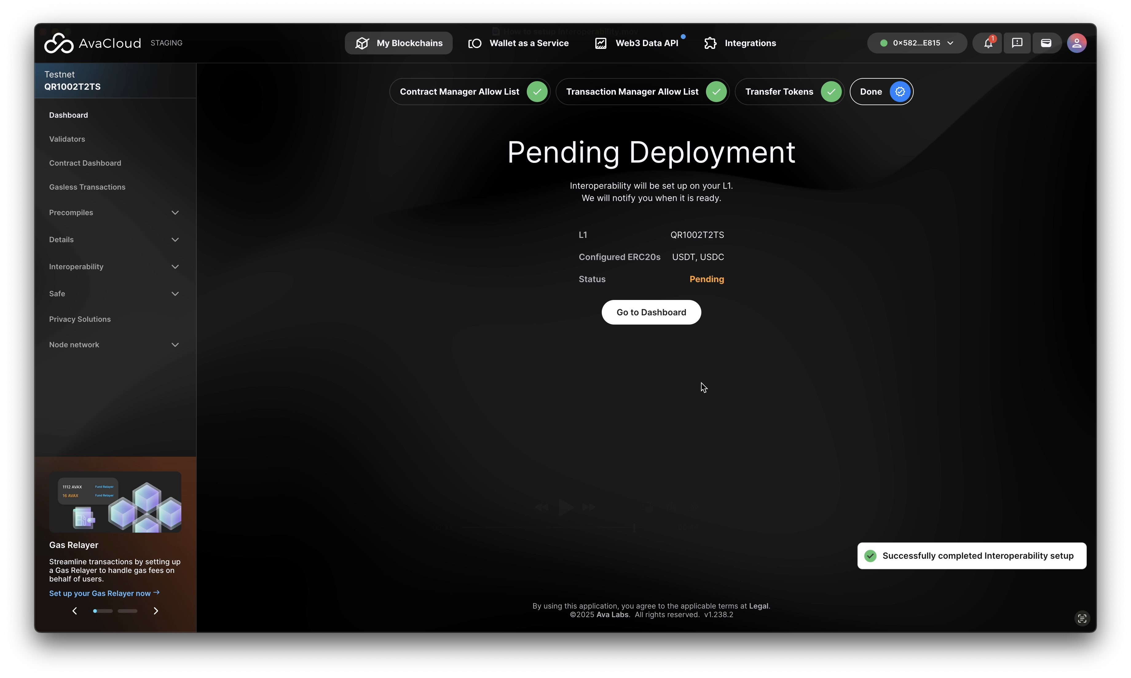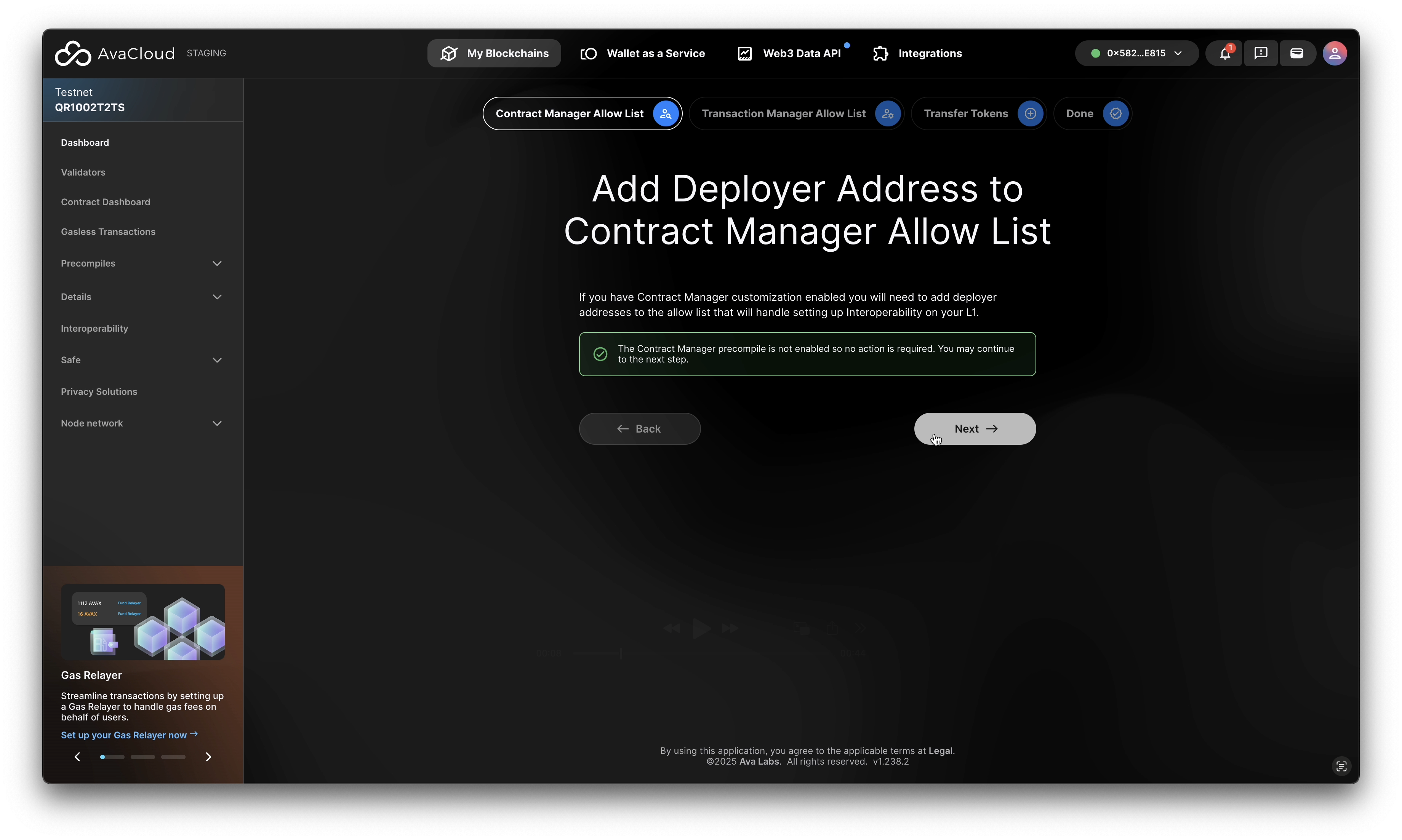 You’ll need to approve a few transactions to add the required relayer addresses to the allowlist (if this precompile isn’t enabled, this step is skipped).