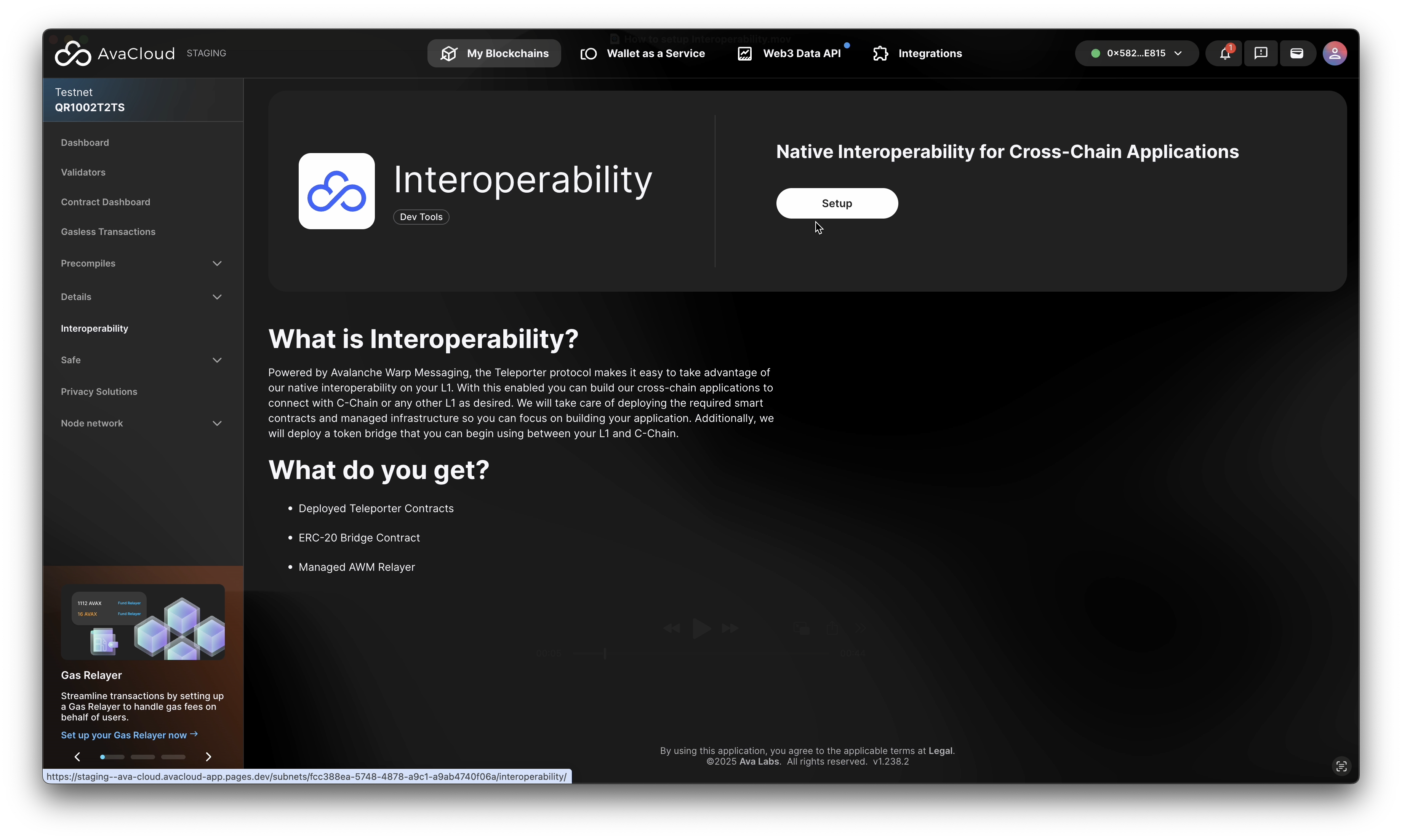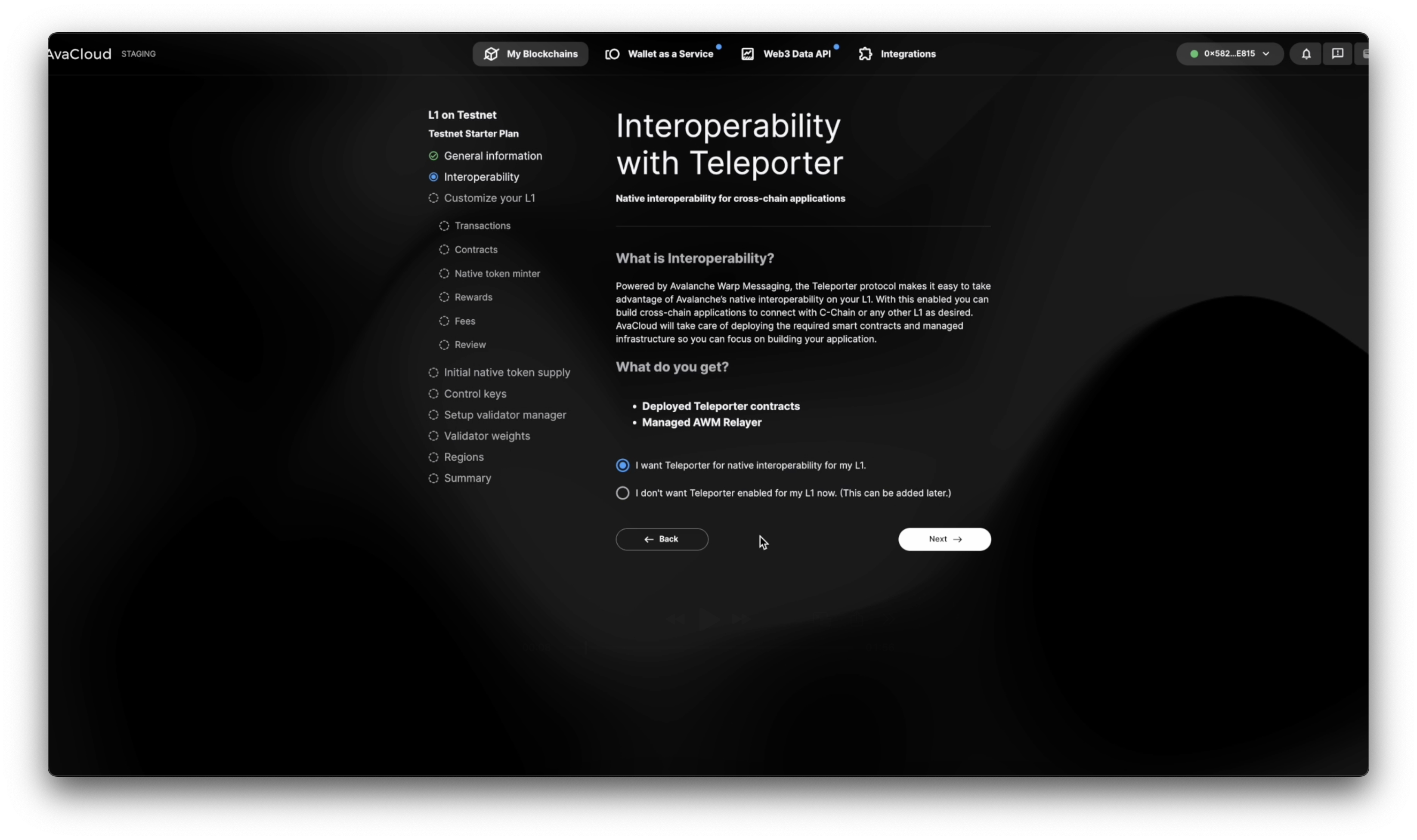When creating your L1 in AvaCloud, you’ll encounter an interoperability configuration step. Select the “I want Teleporter for native interoperability for my L1” option to enable cross-chain messaging and token transfers.