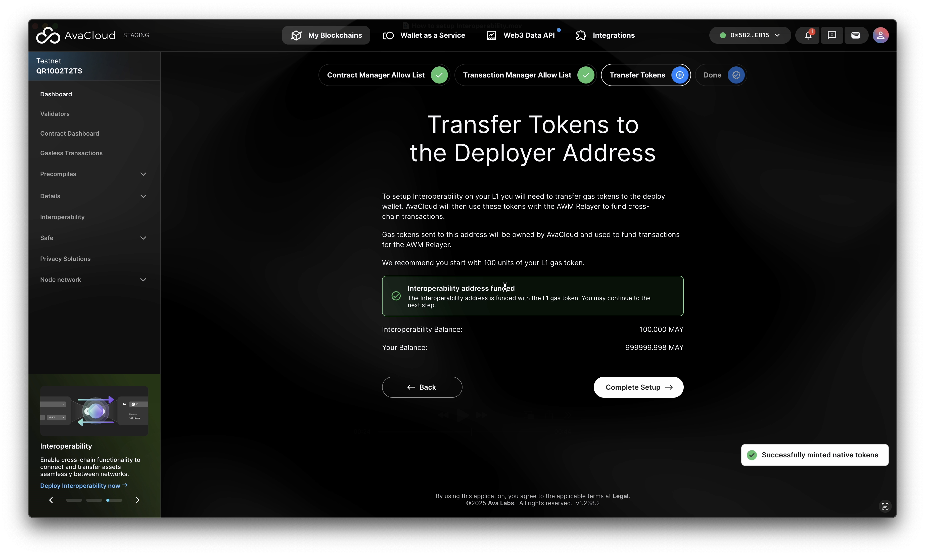 Once the relayer is funded, the portal will proceed to finalize the AWM relayer setup.