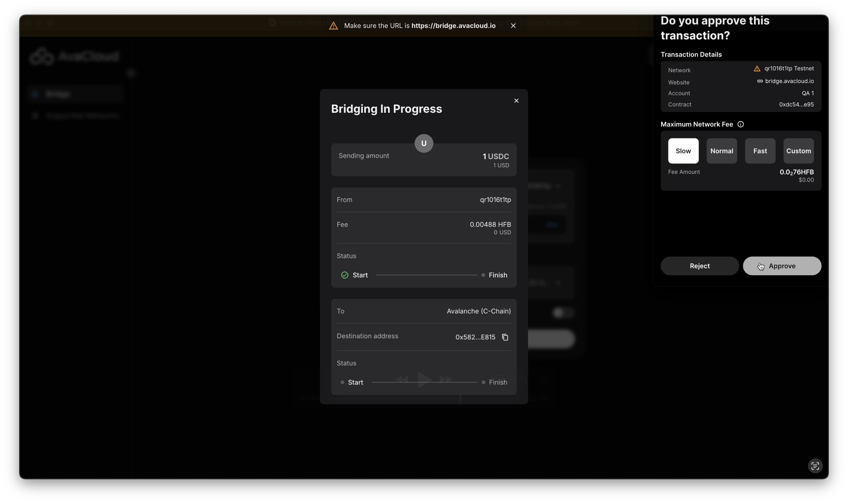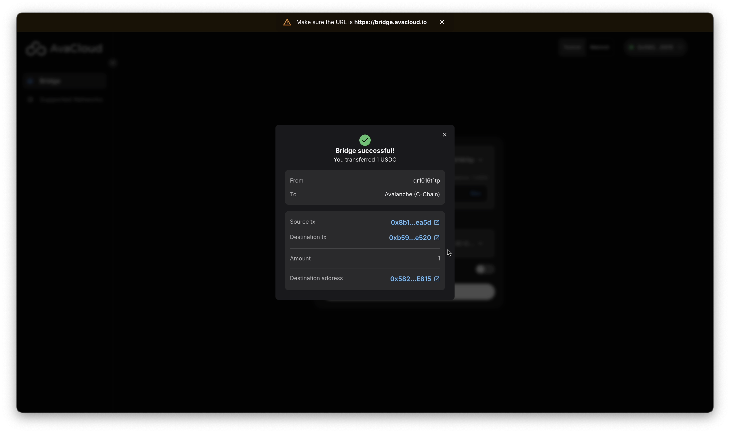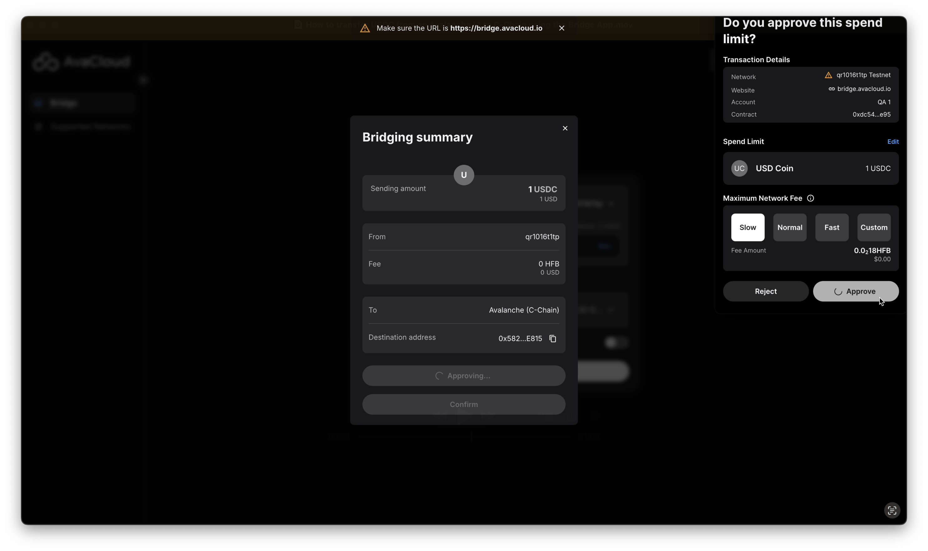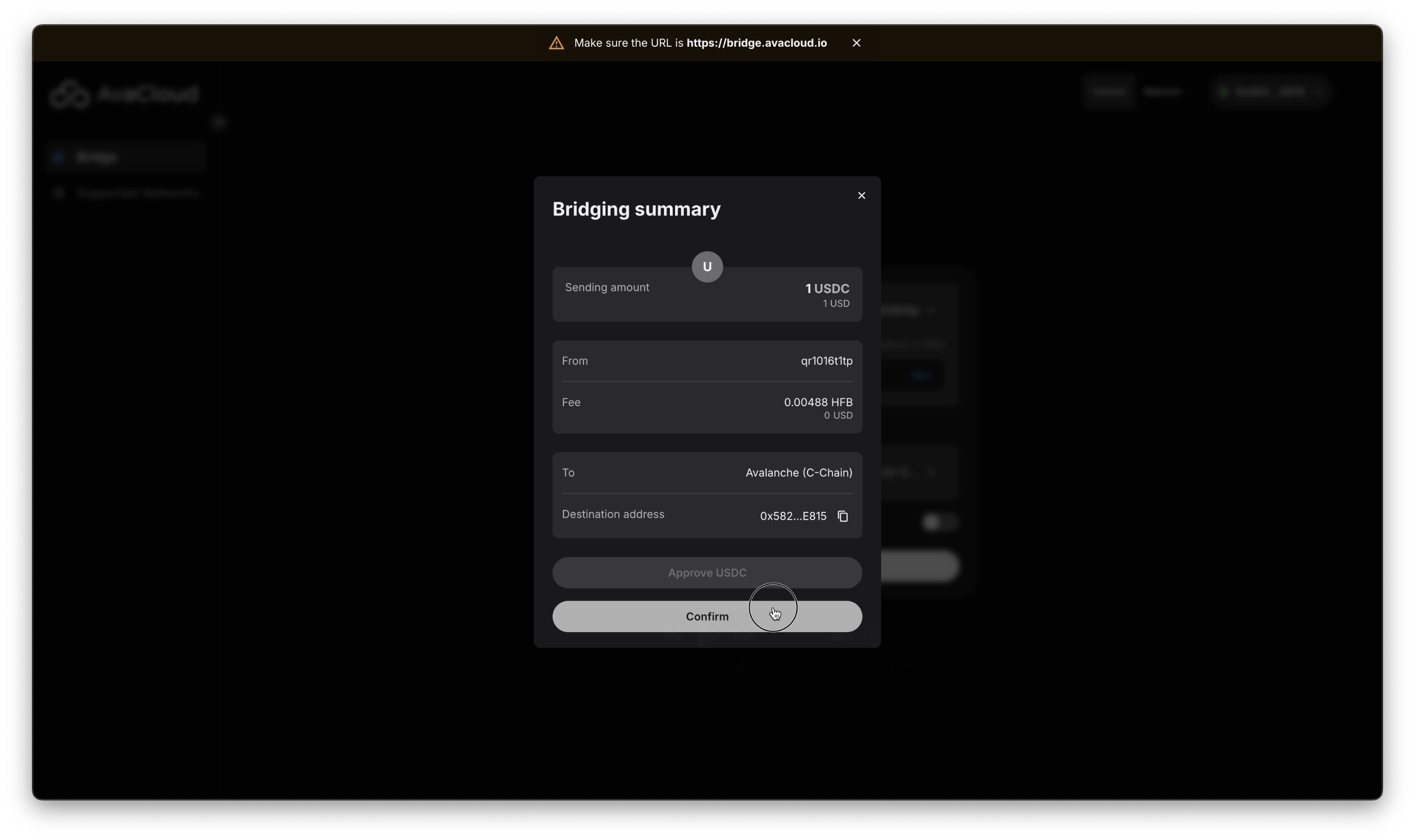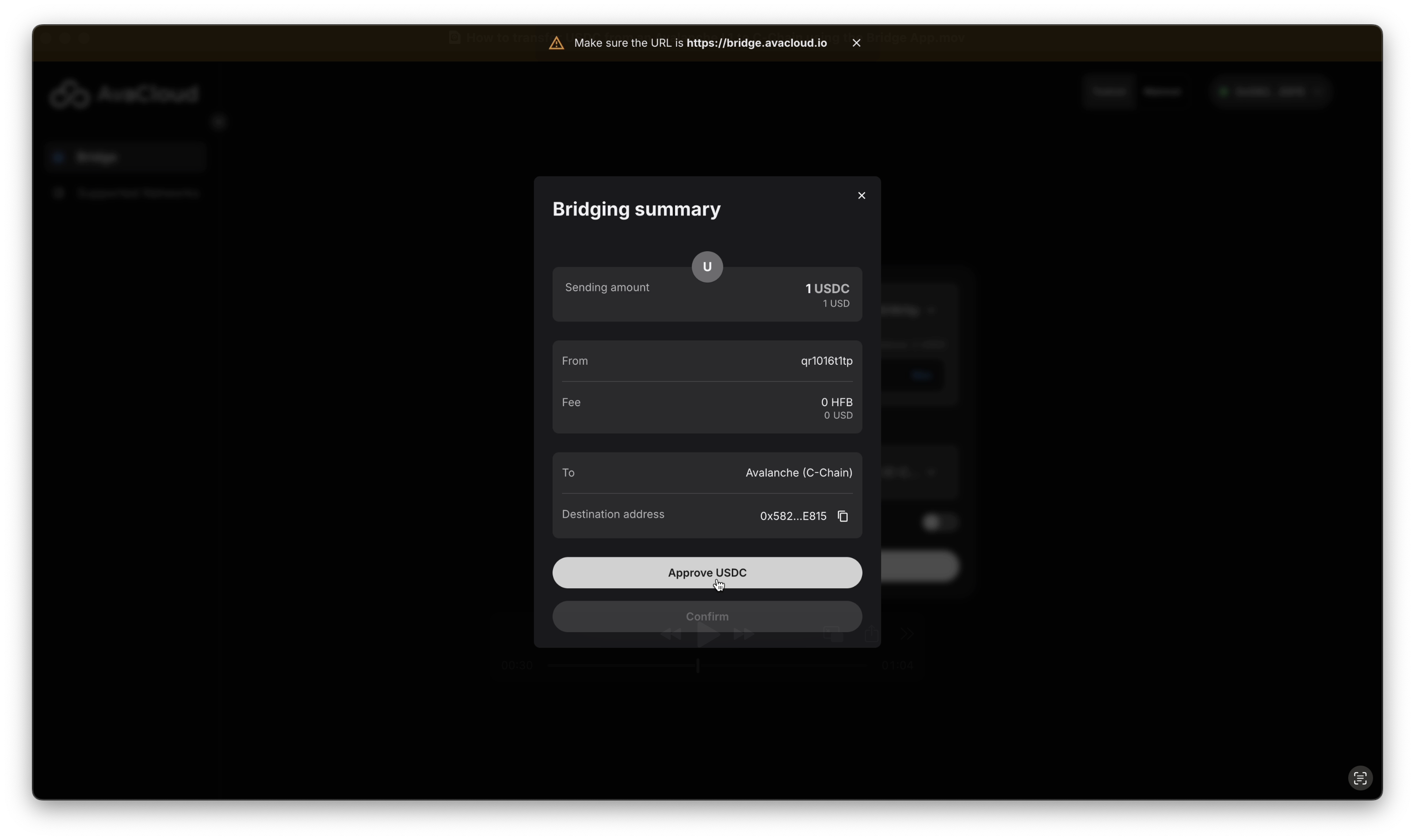 Confirmon AvaCloud Portal, and approve the transaction in the Core Extension. USDC will be sent from the specified L1 (e.g., qr1016t1tp) to C-Chain.