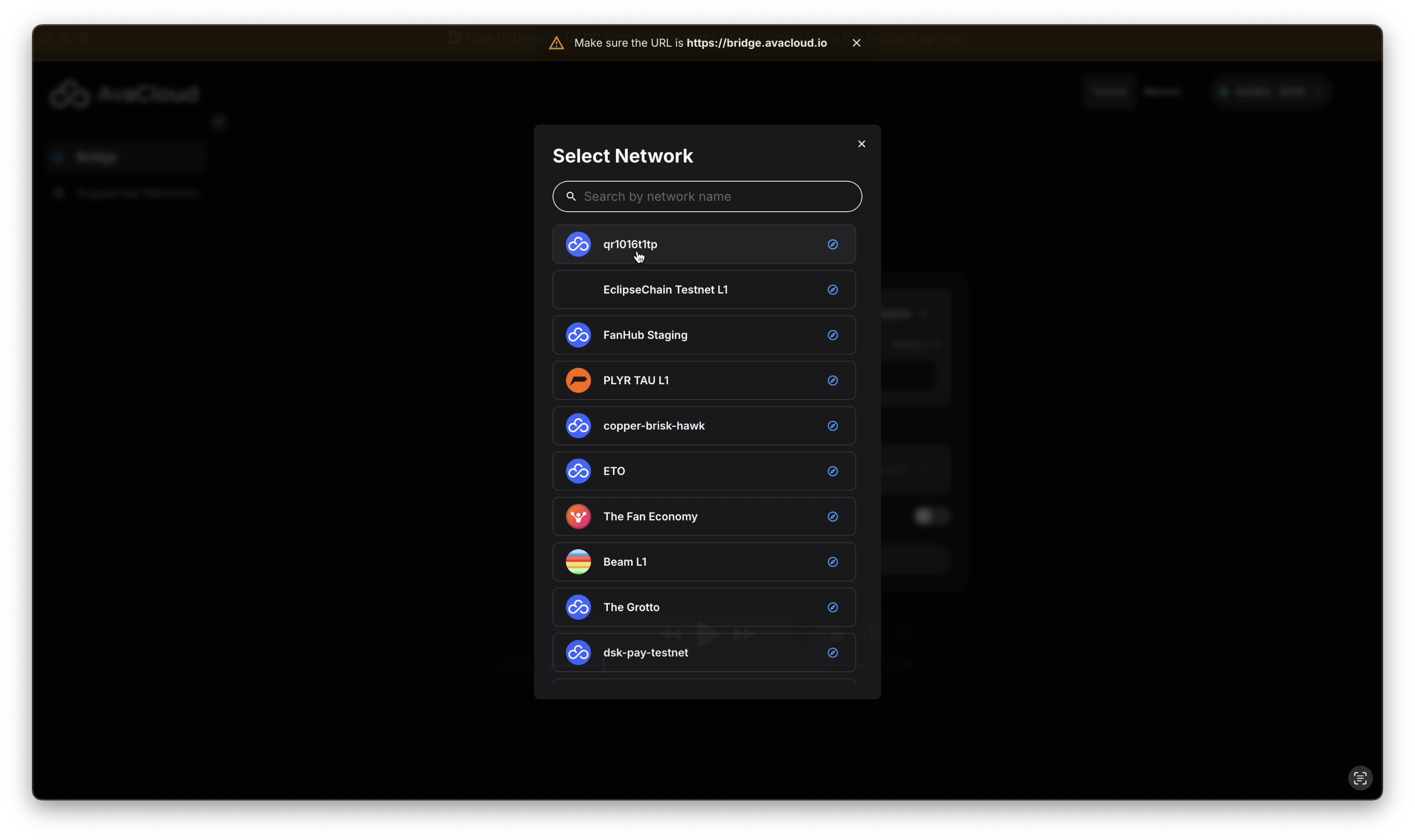 Fromsection, clickSelect Network(top right) and choose your Avalanche L1 (e.g., qr1016t1tp).