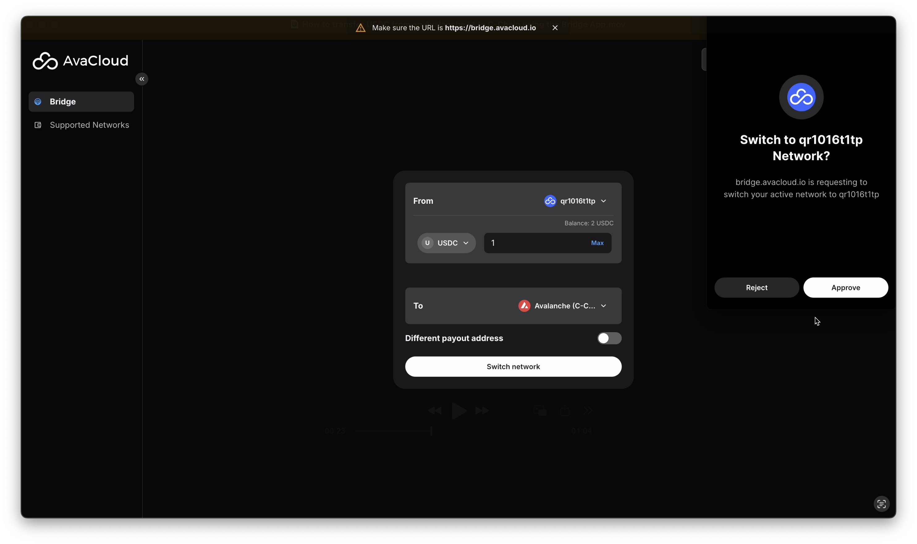 Avalanche C-Chain, we would need to switch toqr1016t1tpfirst after clicking on theSwitch networkbutton.