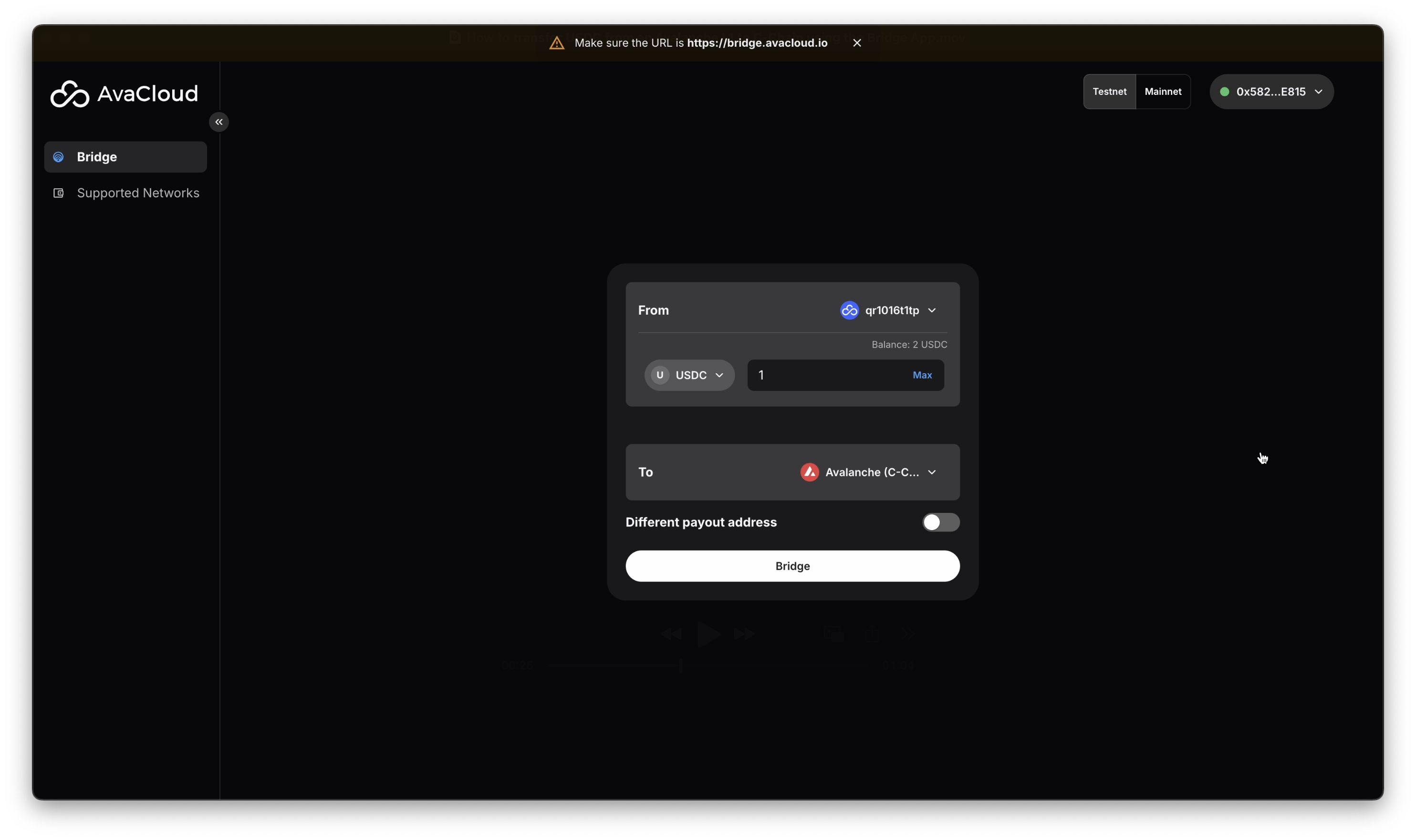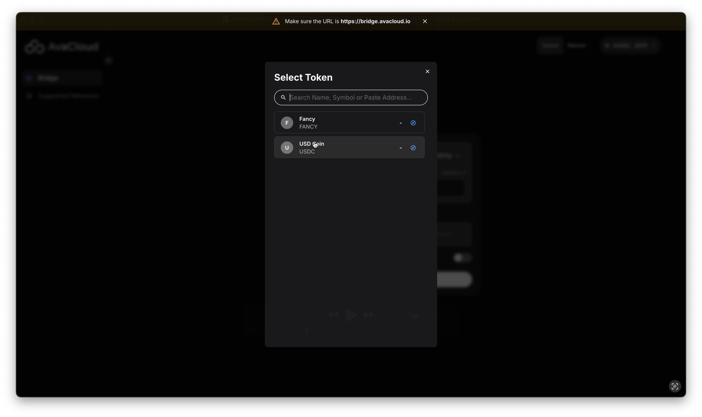 Go to bridge.avacloud.io and connect your Core Extension wallet. Make sure you’re on the correct Testnet or Mainnet.
