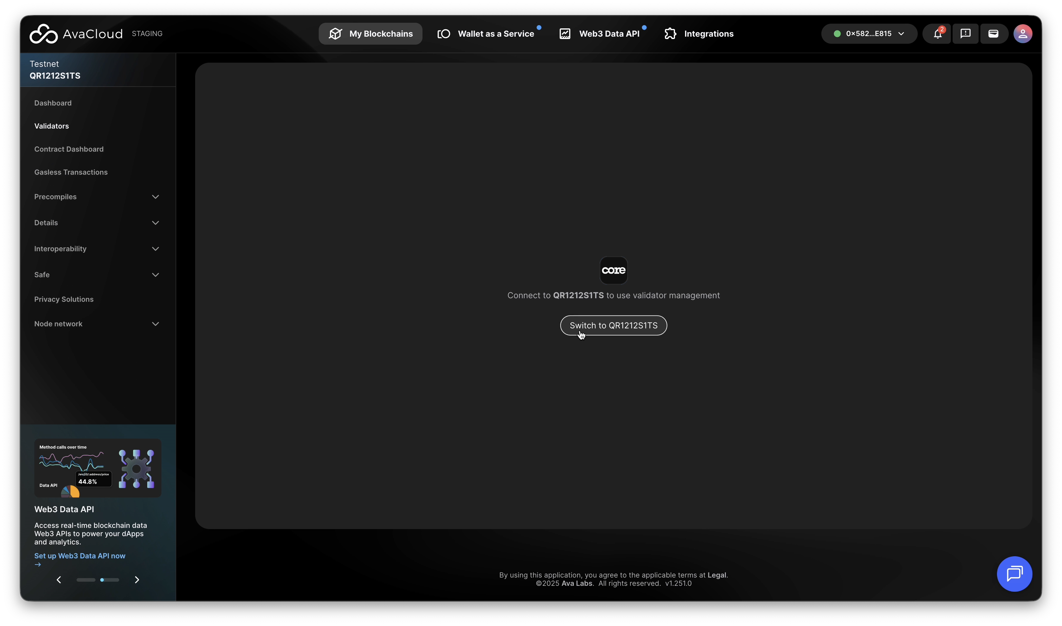 - Connect the Core Extension to the AvaCloud portal and select the wallet account which is the validator manager owner.