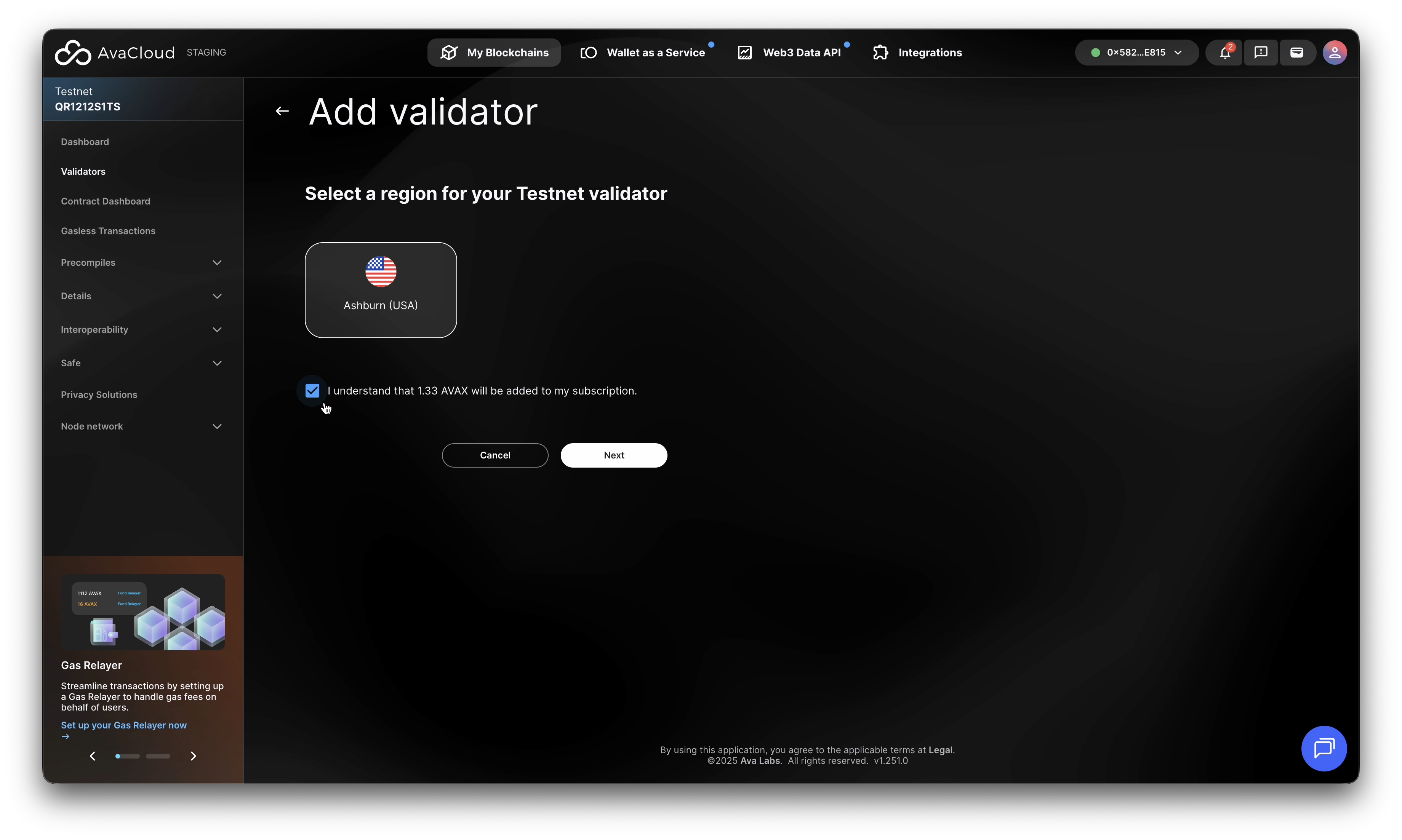 Confirm that 1.33 AVAX is automatically added to your monthly subscription, this is only for Mainnet, as Testnet AVAX does not have real dollar value.