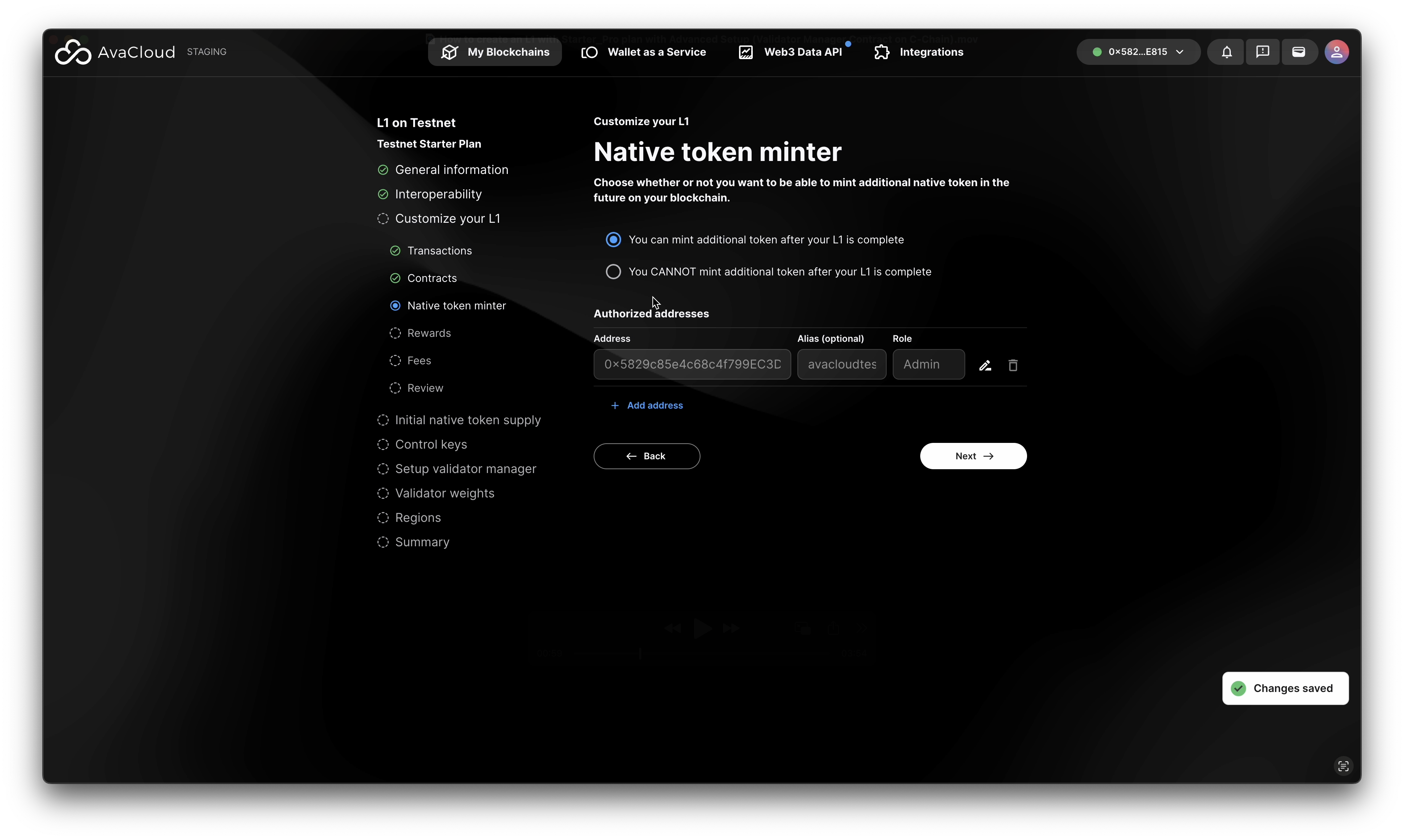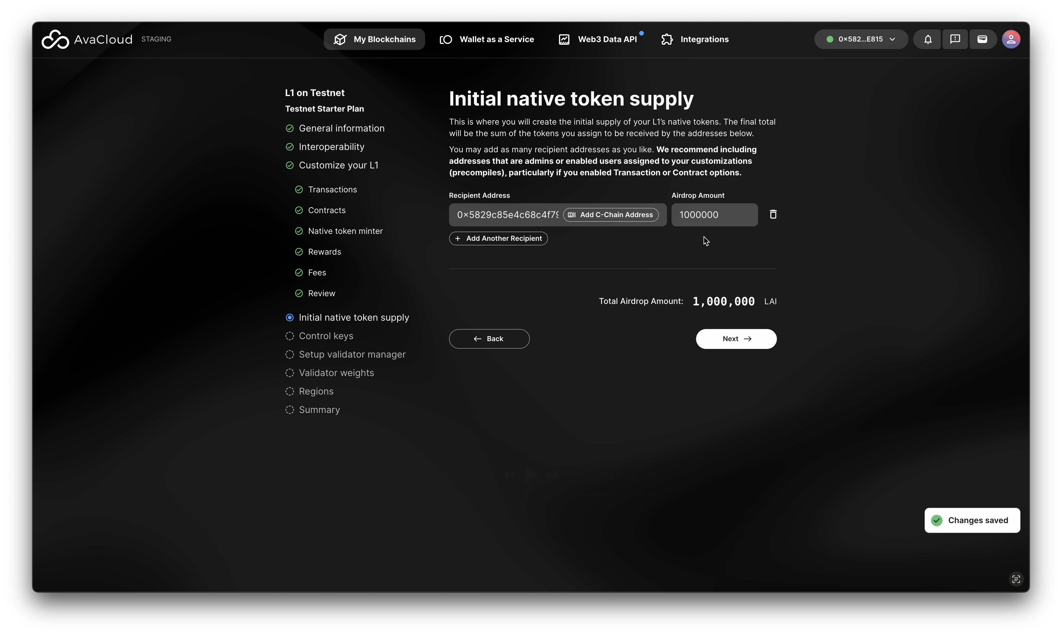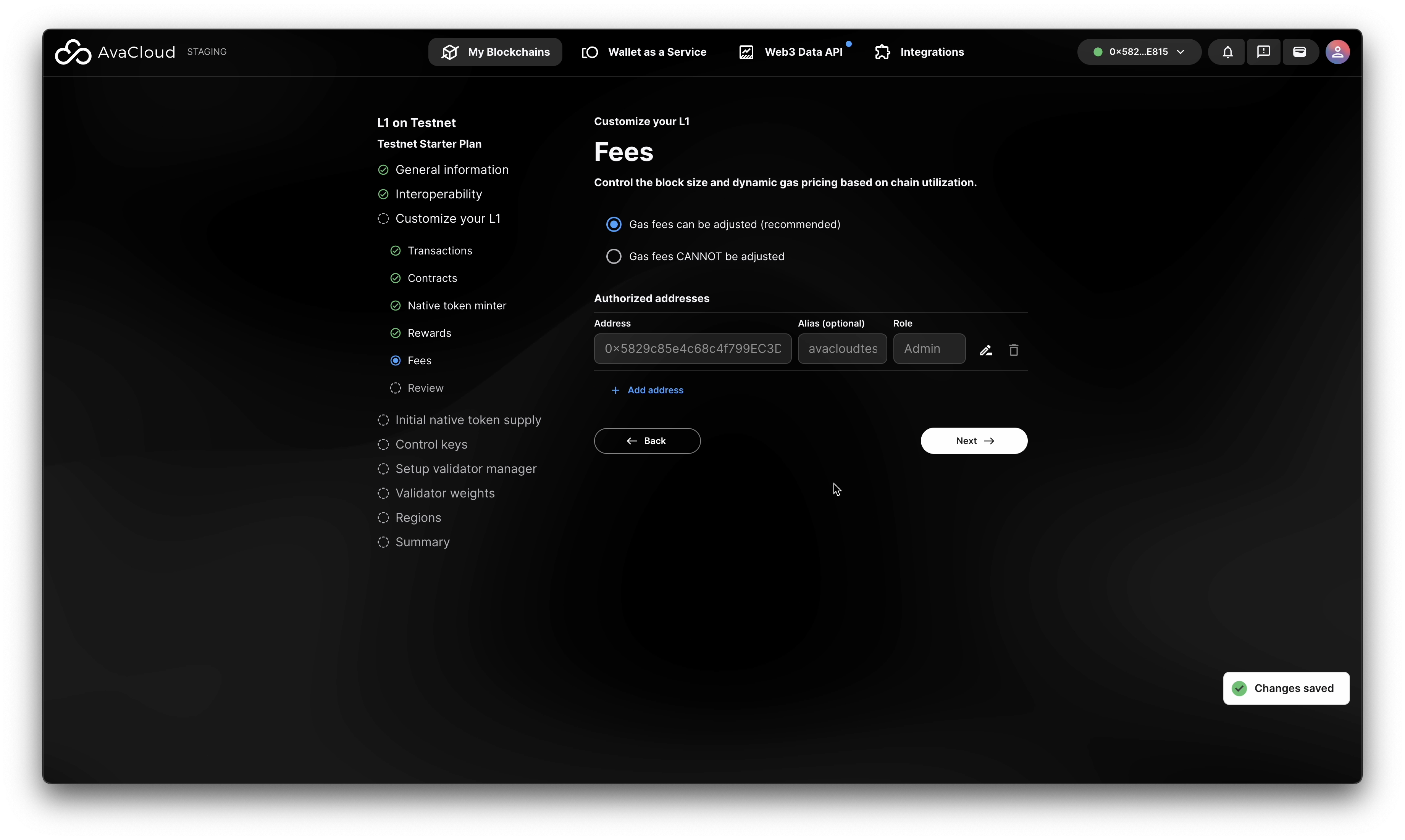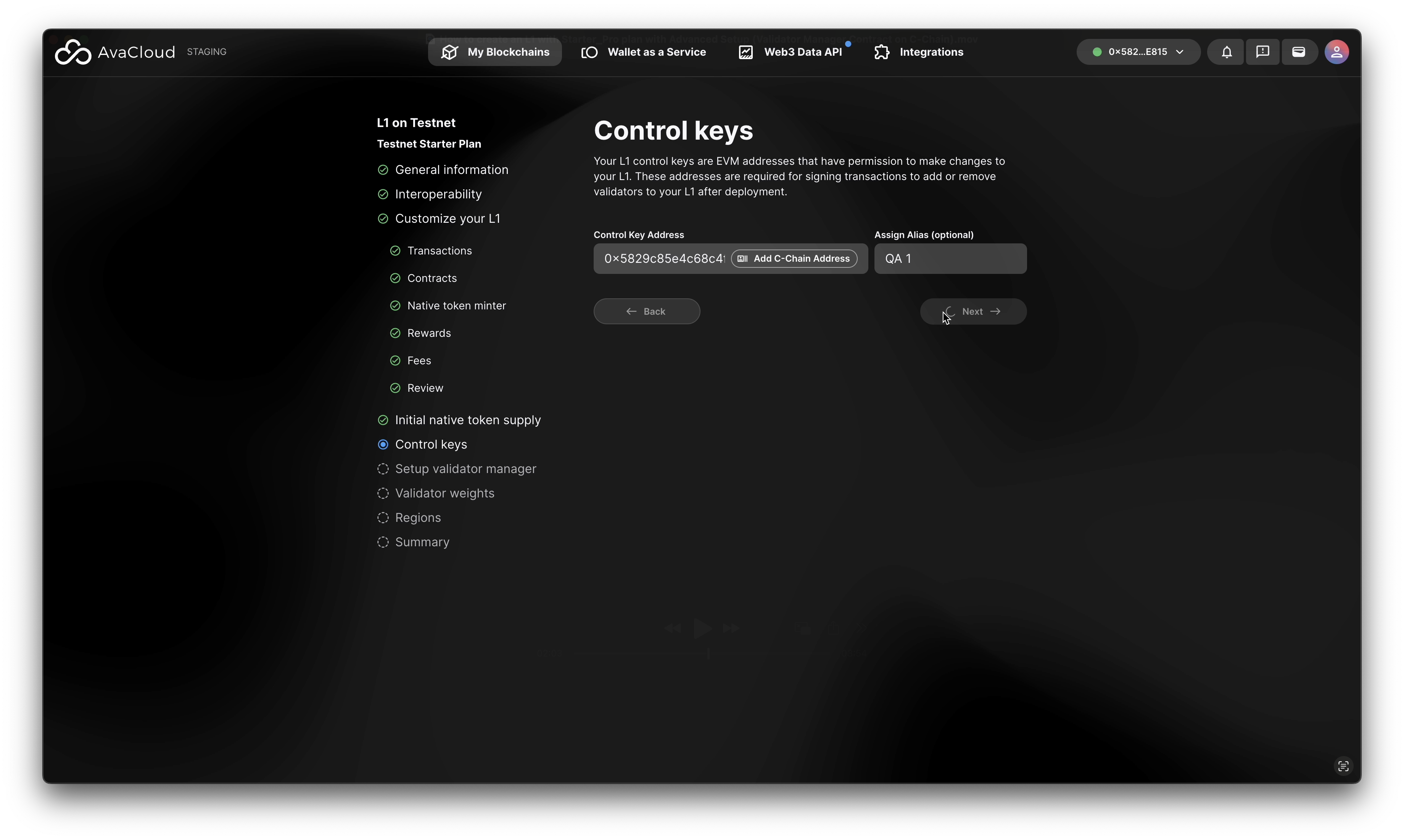 - Enter a single address as the Control Key for managing your blockchain. This address is required to sign setup transactions and add validators. You can set up a multisig account later in the portal.