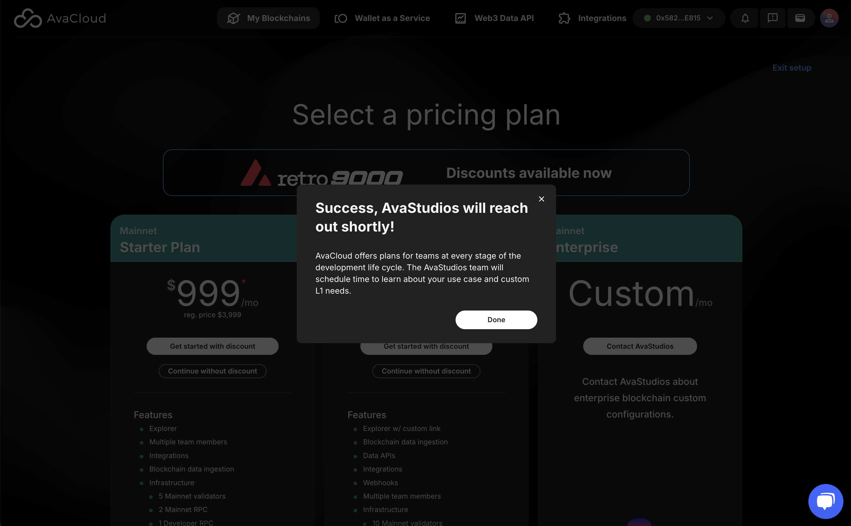 Your request will be sent to the AvaCloud team, who will contact you directly to discuss next steps and finalize your Enterprise L1 setup.