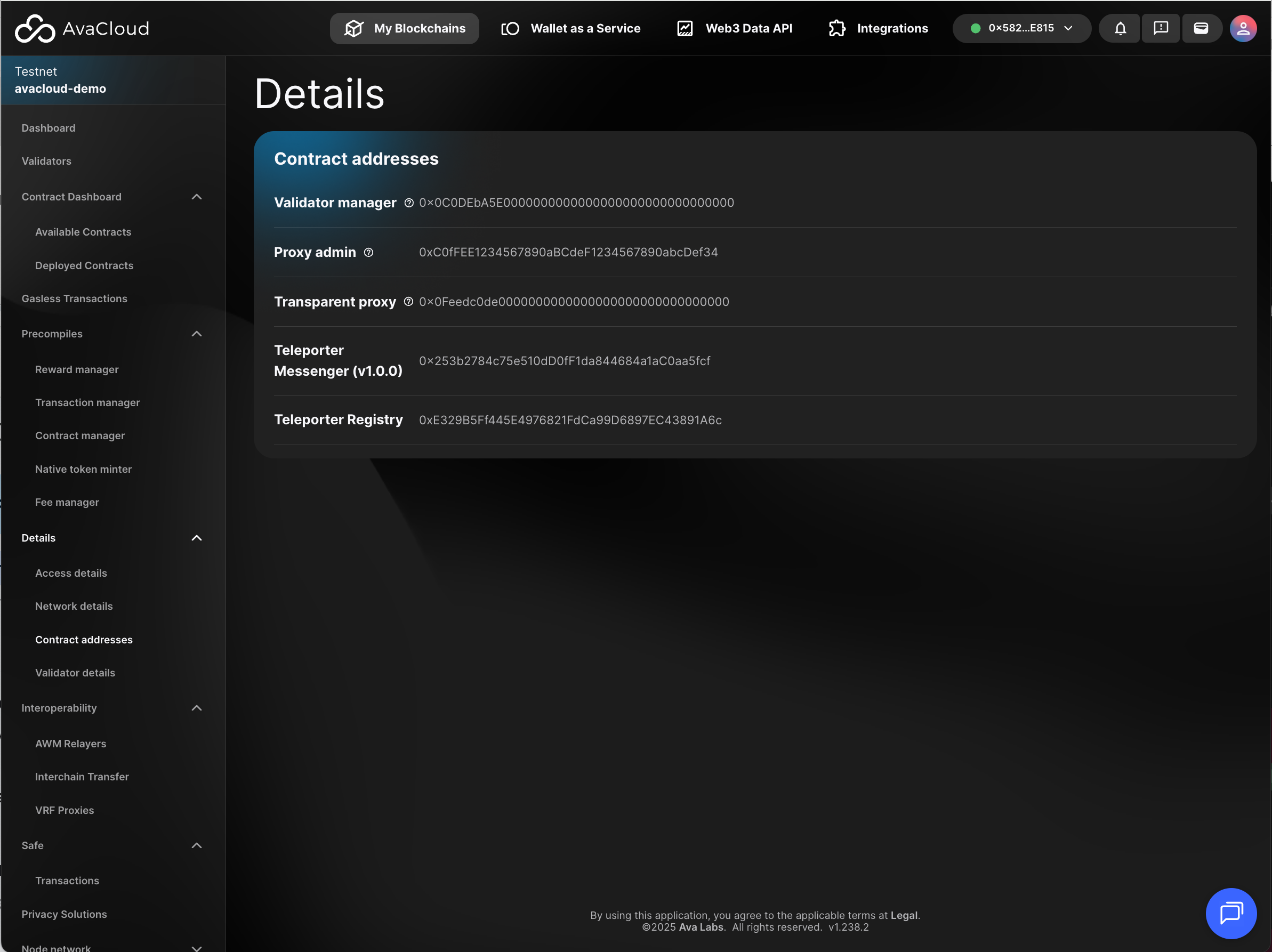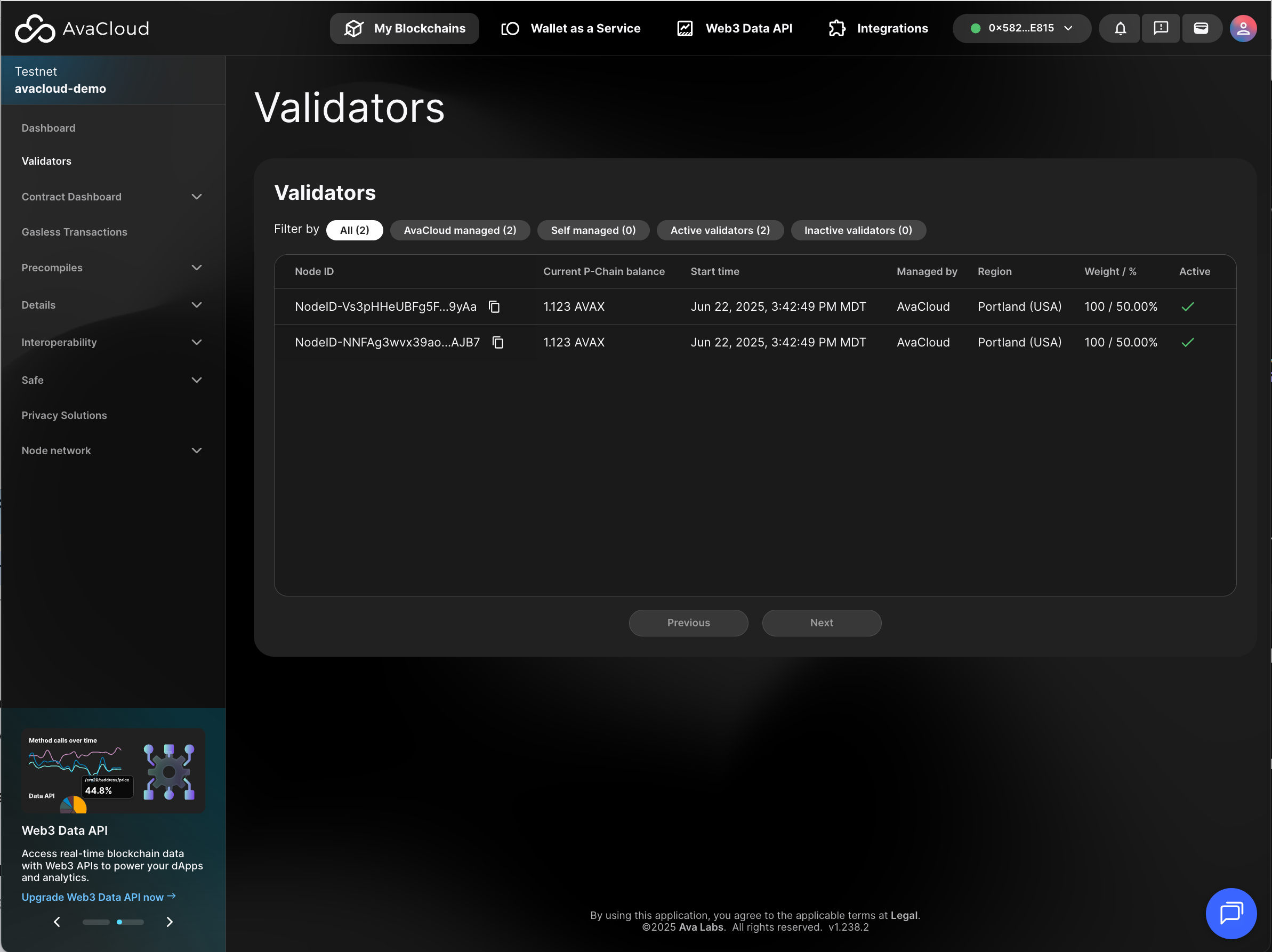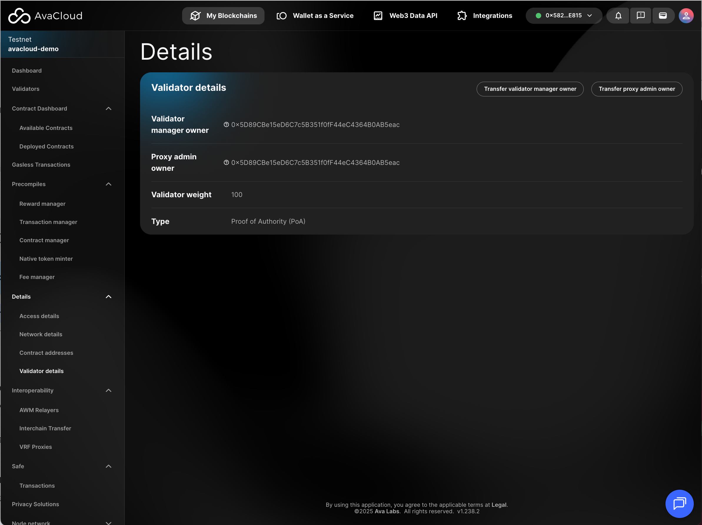 Review details for each validator node associated with your L1. You’ll also find controls for transferring ownership of the validator manager and proxy admin here.