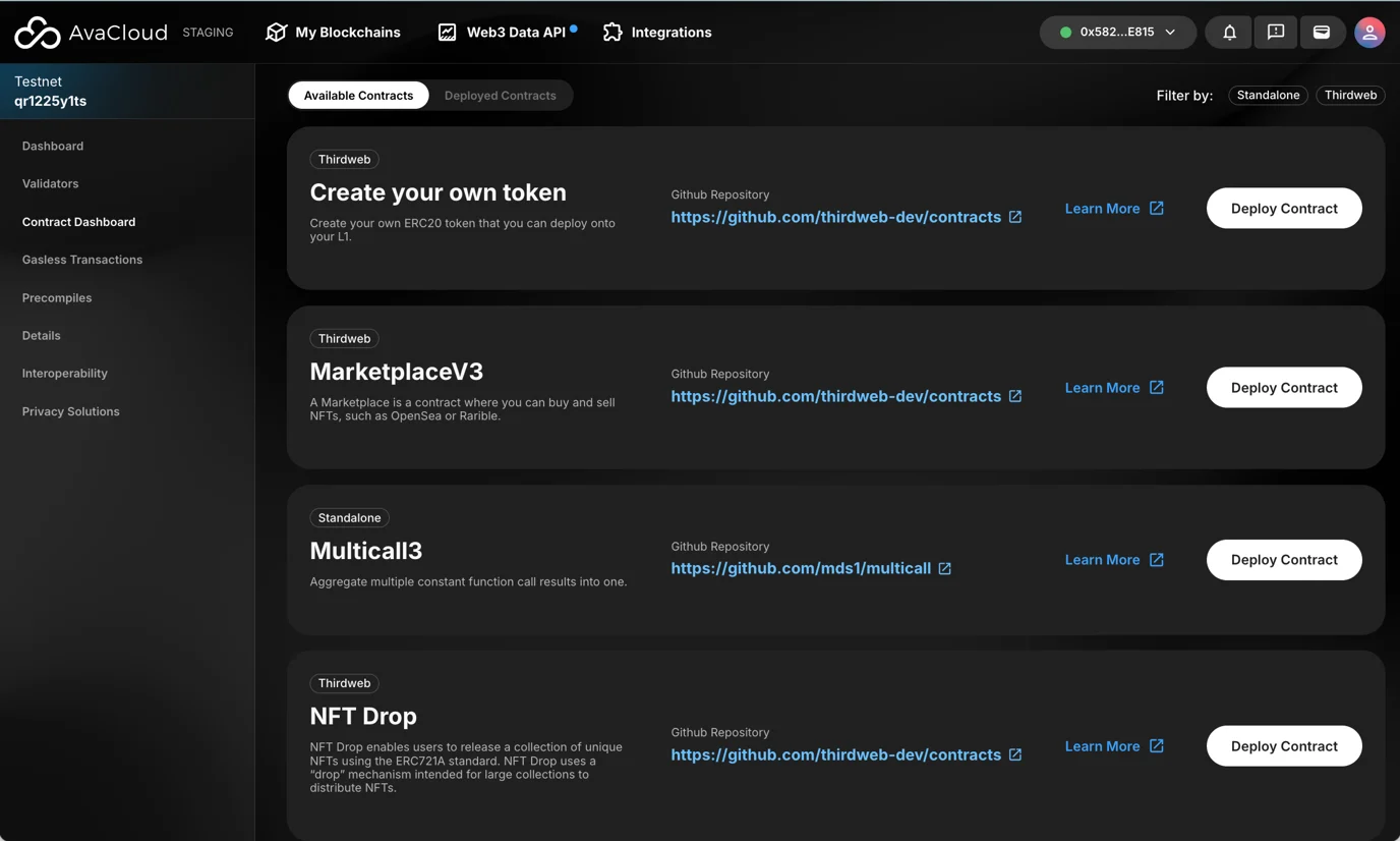 View and manage smart contracts deployed on your L1. This section provides insights into contract activity and deployment status.