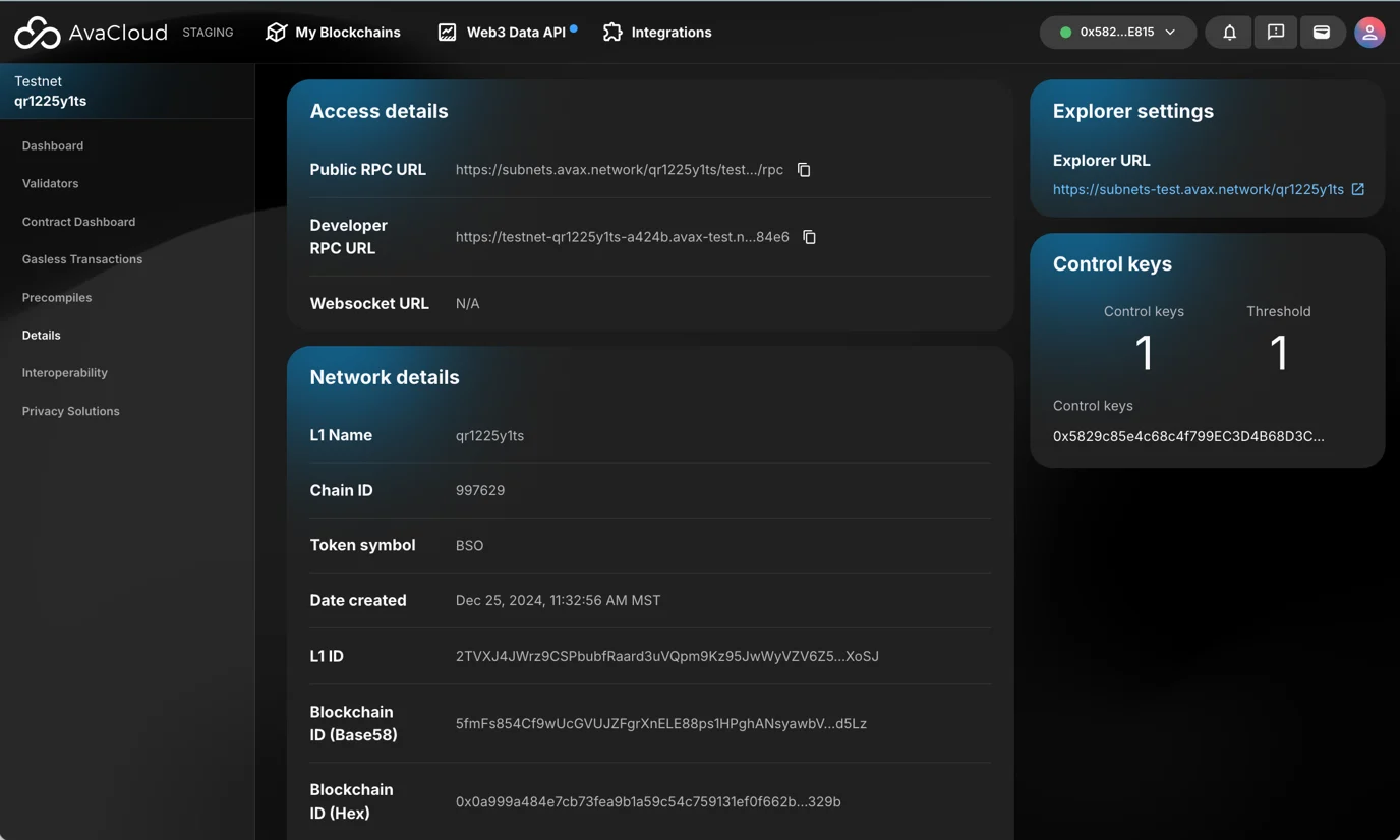 Get a detailed breakdown of your L1, including L1 ID, VM type, and all associated URLs and endpoints.