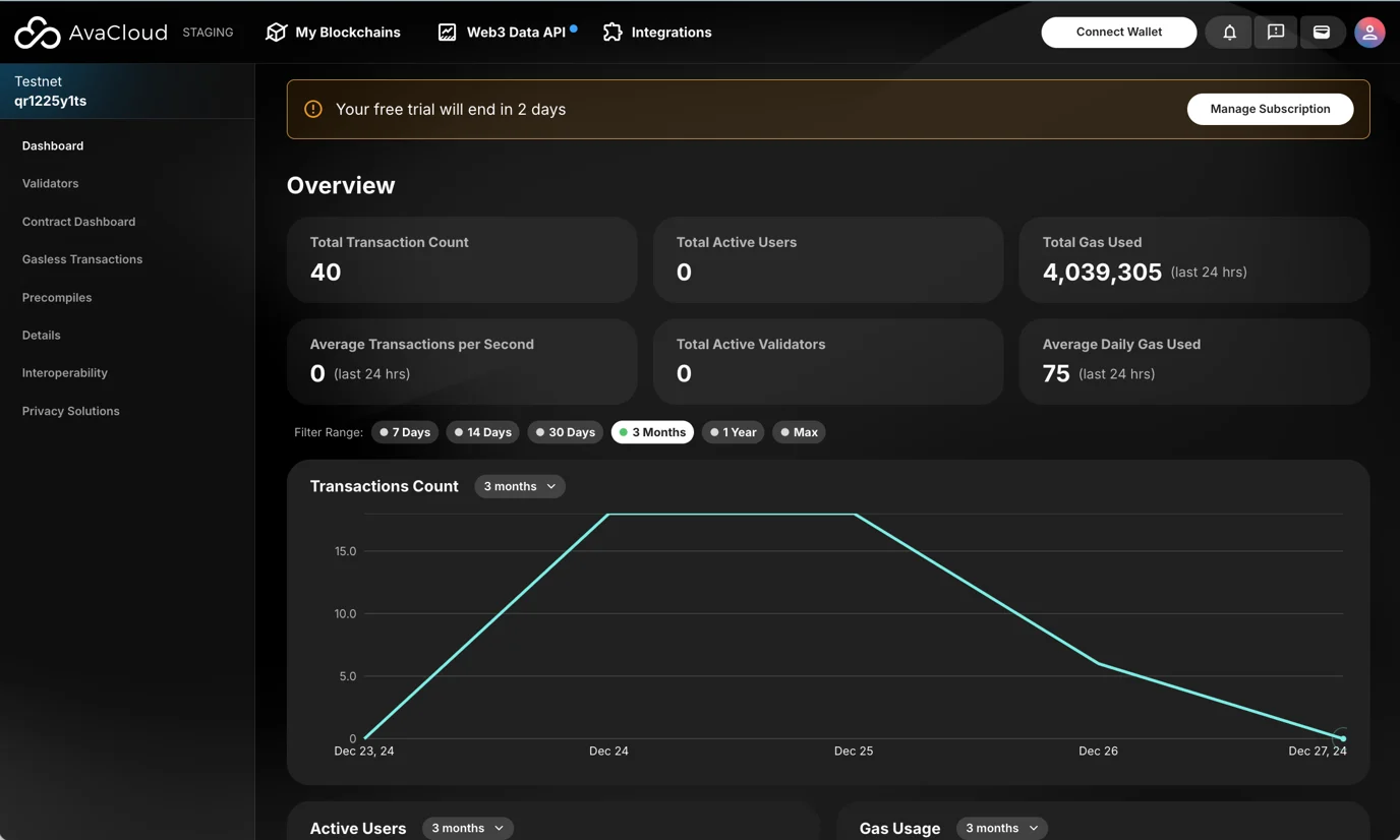 The L1 Dashboard in the AvaCloud Portal provides a comprehensive interface for monitoring and managing your L1 blockchain. This page outlines the key features and sections available within the dashboard.