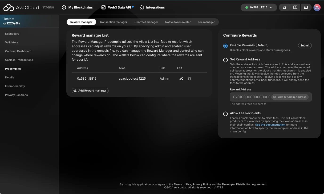 The Precompiles section allows administrators to configure access to advanced L1 features and manage protocol-level settings. Learn more about precompiles in this guide.