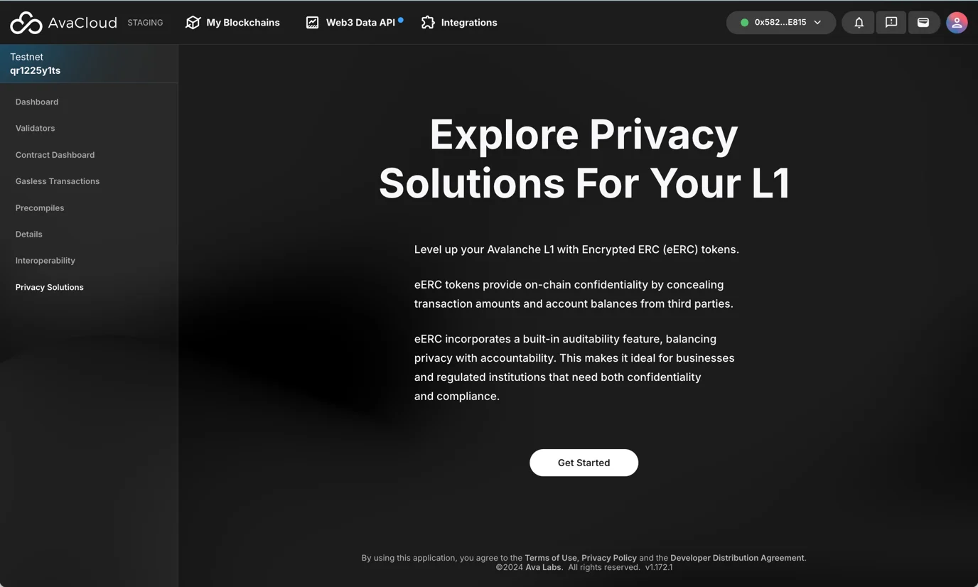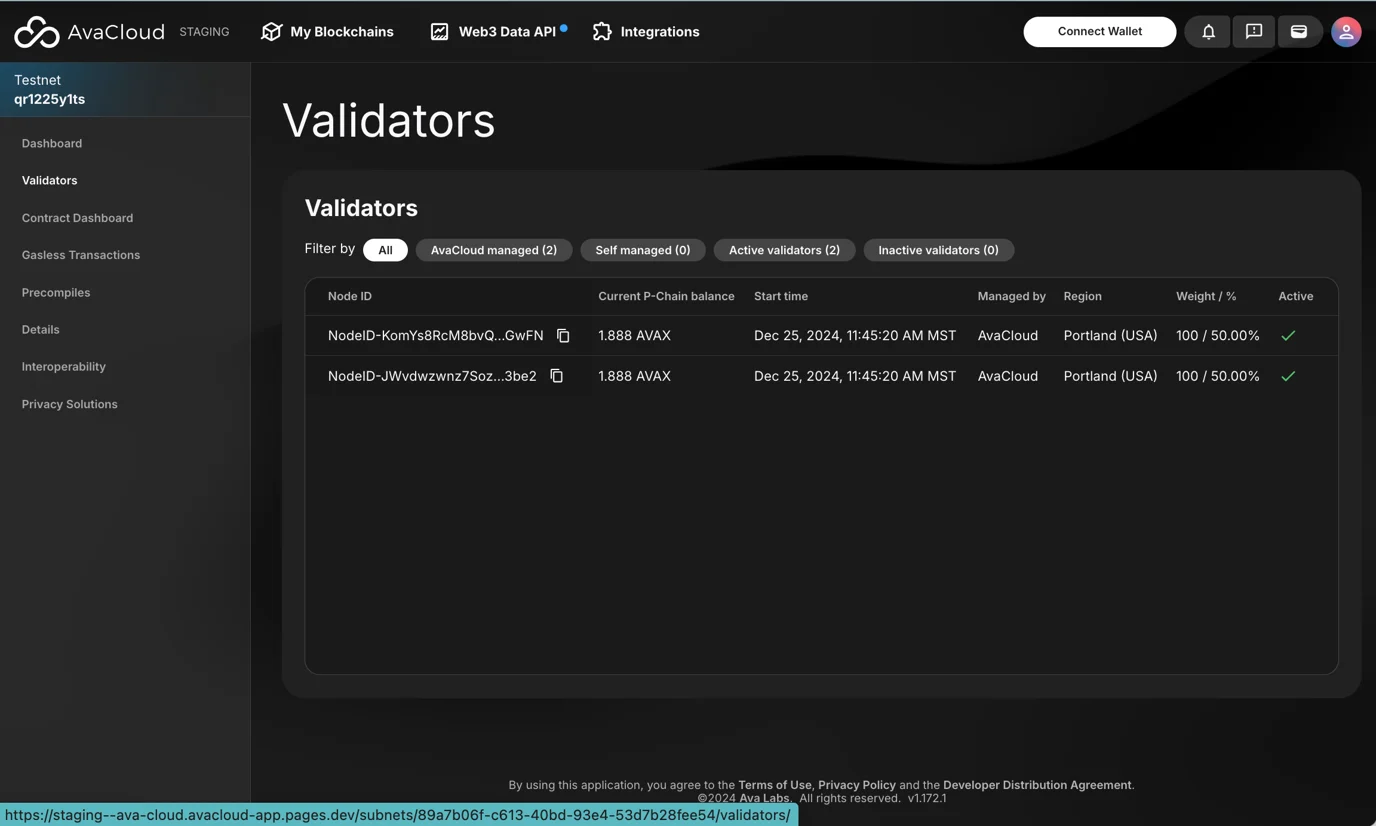 After logging into the AvaCloud Portal, navigate to the My Blockchains view. Here, you’ll see a list of all L1s associated with your account, along with their current development stages. You can toggle between Mainnet and Testnet to view the relevant networks. Click on any L1 to open its dedicated dashboard.