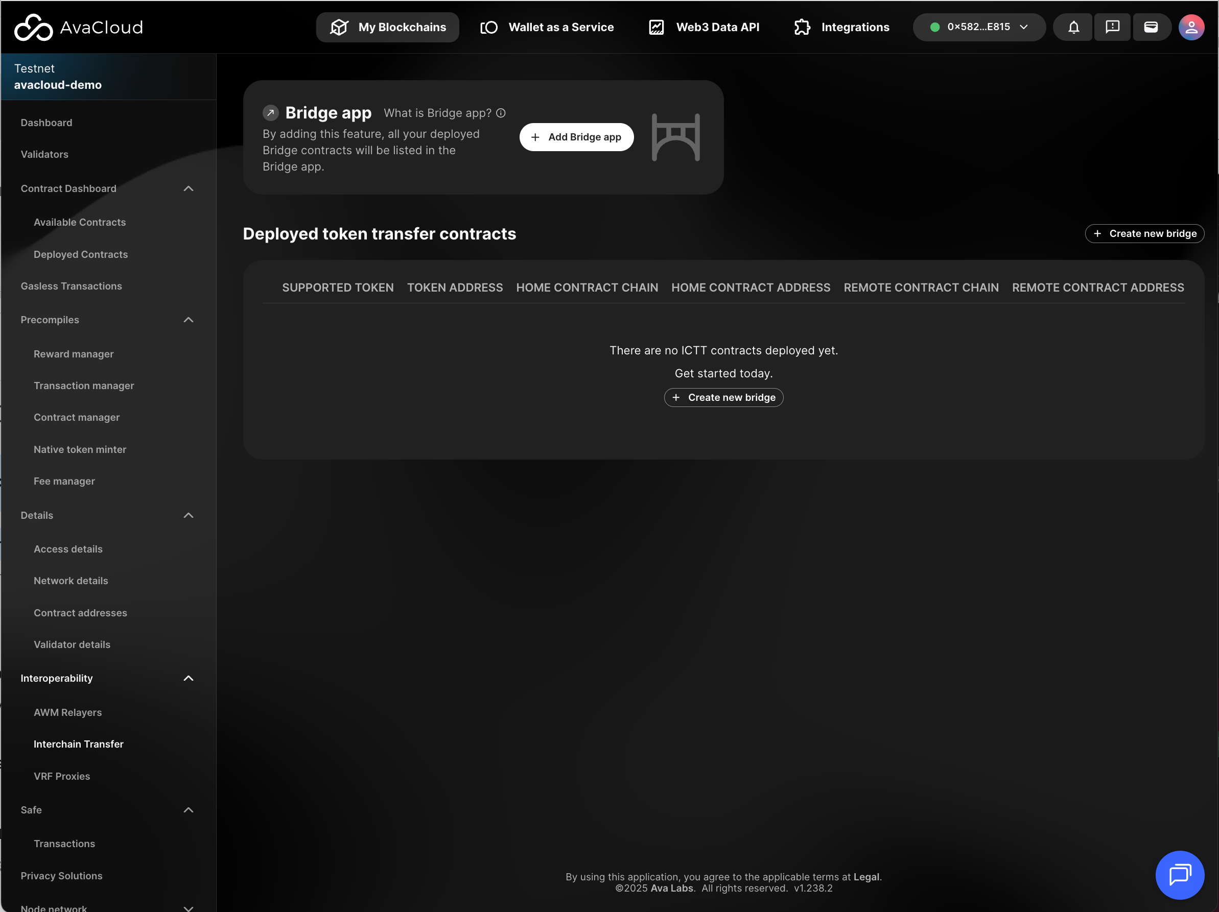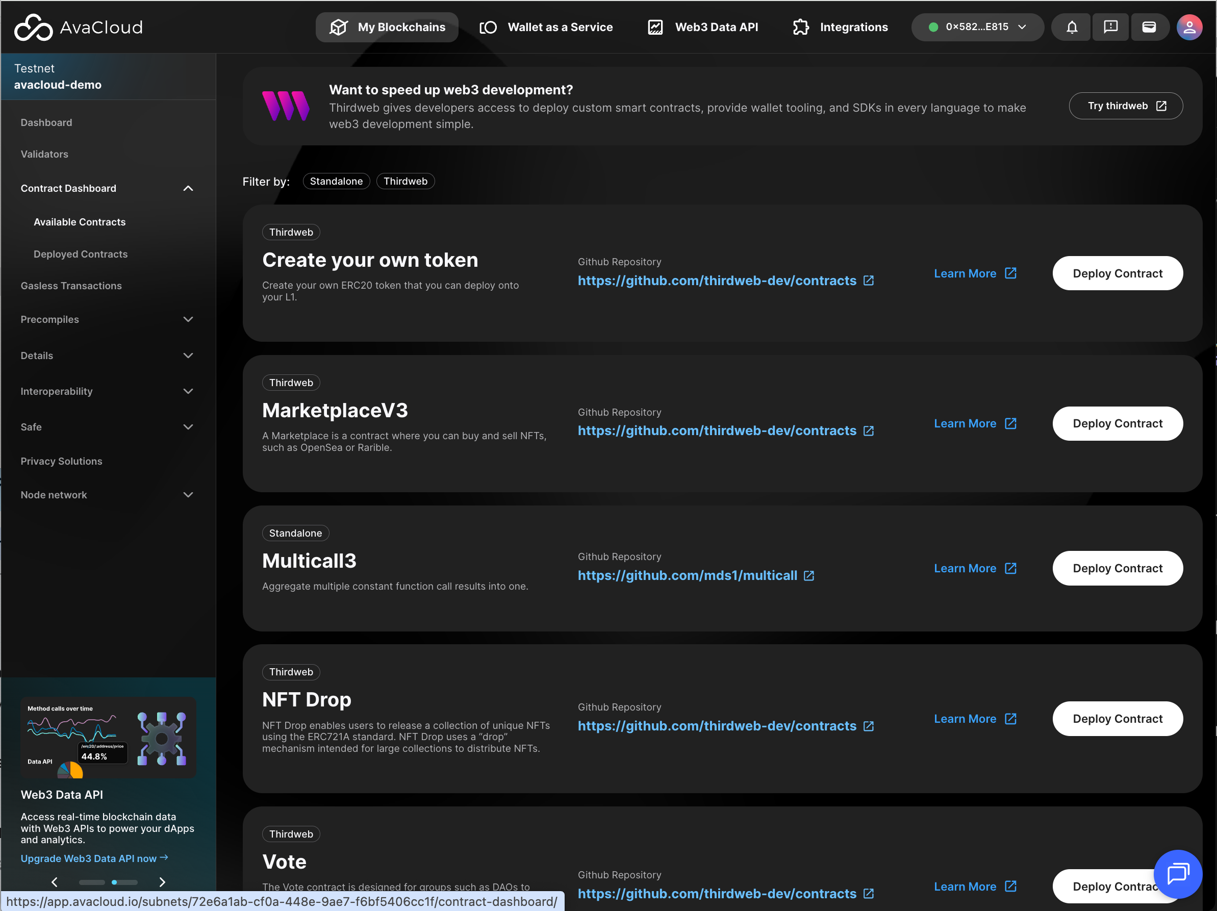 Browse and manage smart contracts deployed on your L1. Review contract activity and deployment status here.