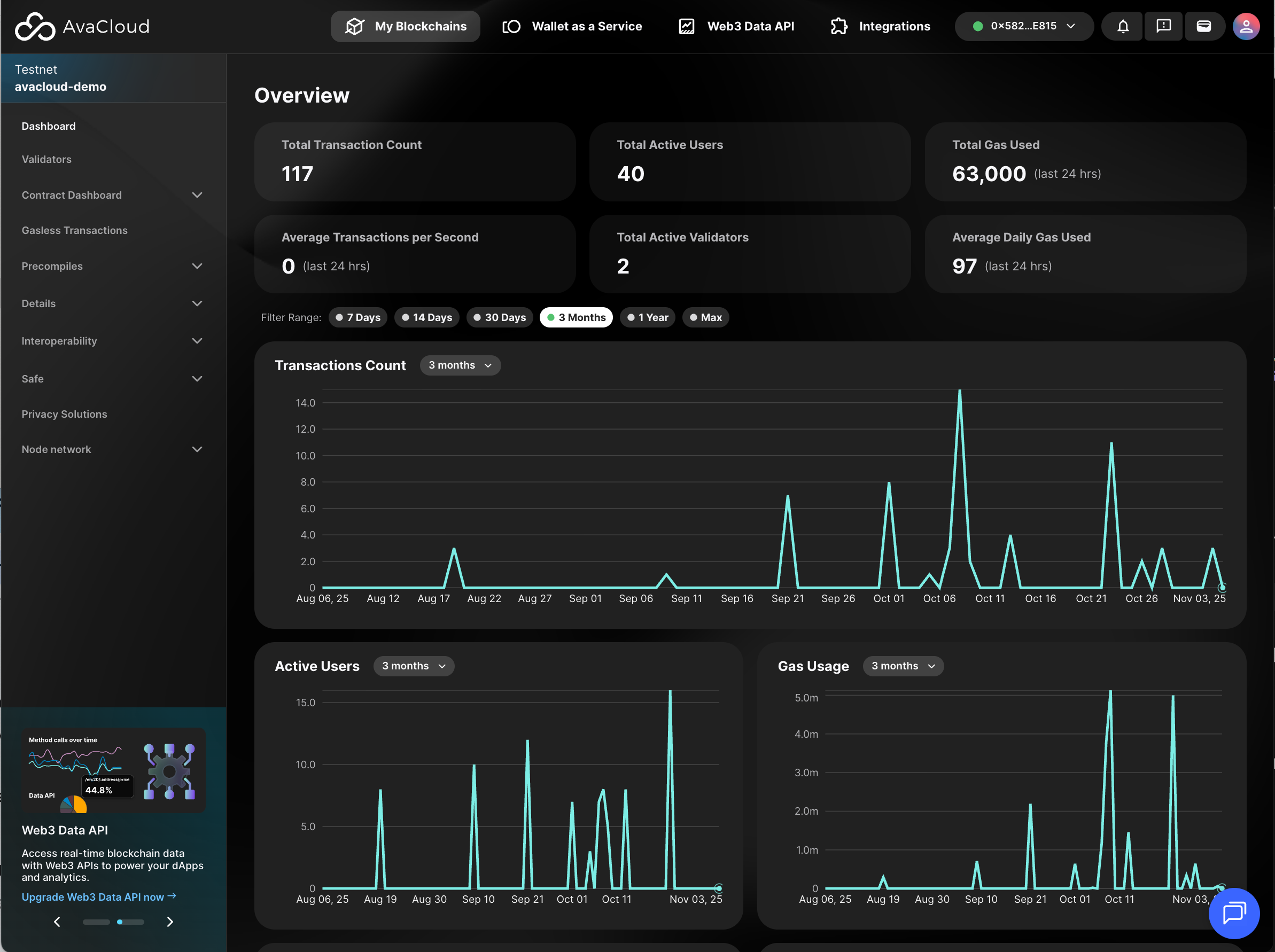 The L1 Dashboard in the AvaCloud Portal is your central hub for observing, configuring, and maintaining your L1 blockchain. This guide summarizes the main dashboard features and how each section empowers you to manage your L1 environment effectively.