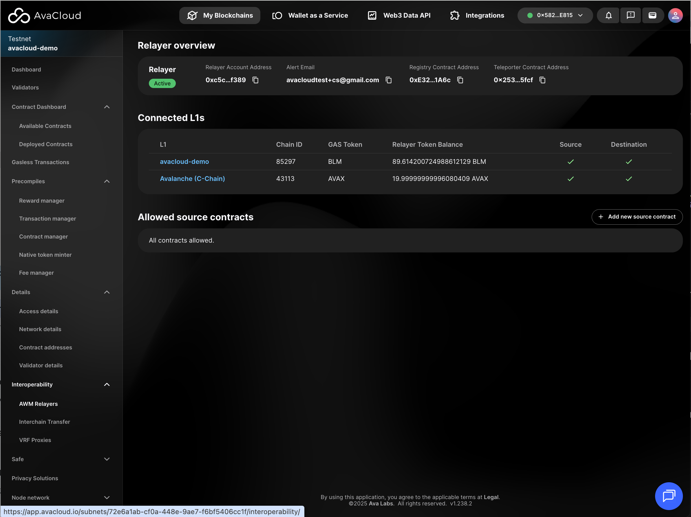Access settings for interoperability features such as cross-chain messaging and token transfers. For more, visit the interoperability docs.