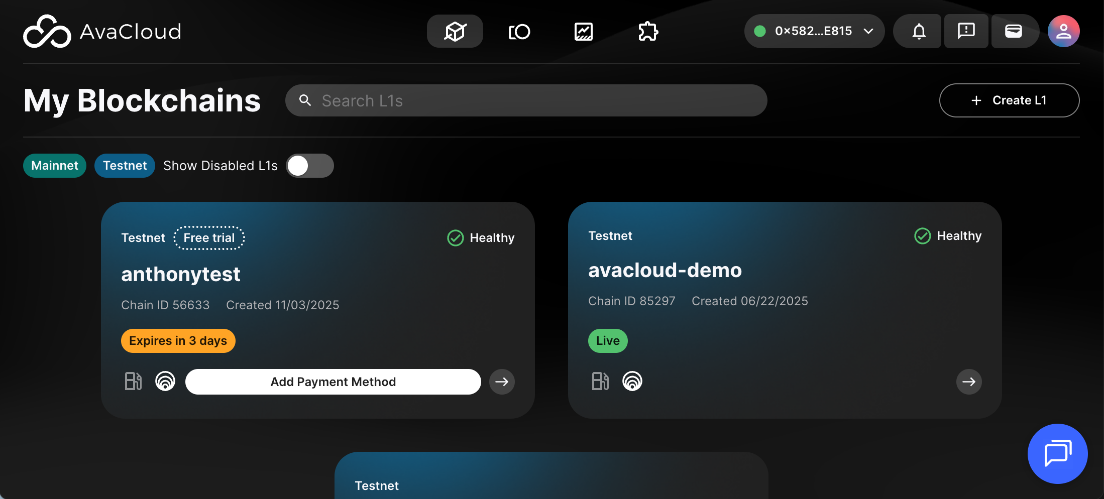 Make sure you have already set up an L1 blockchain. If you need help, refer to creating an L1 with the free trial or creating an L1 with a Starter/Pro plan.