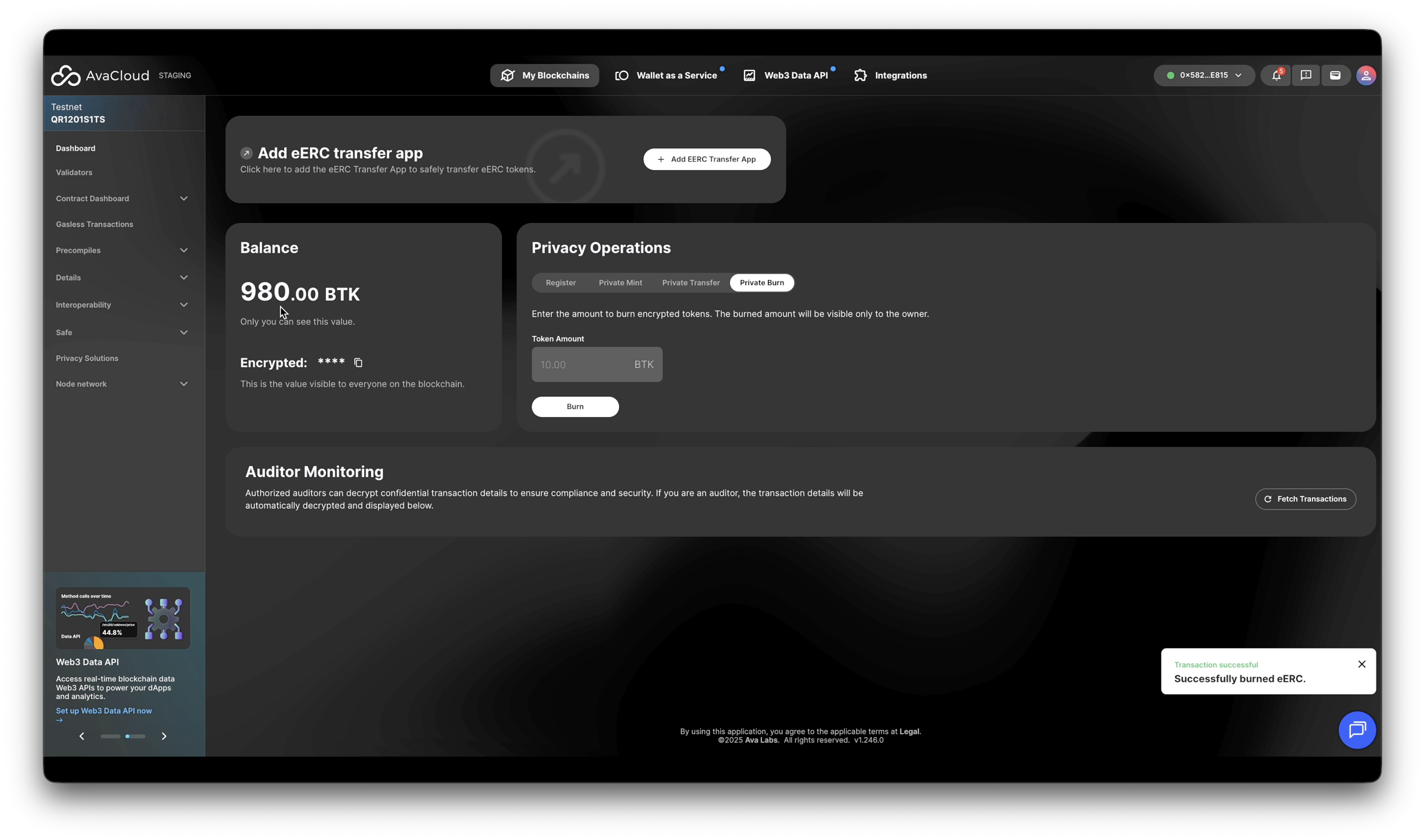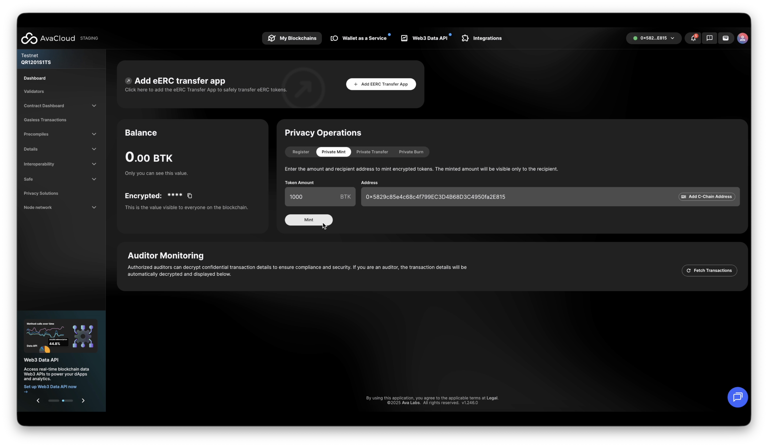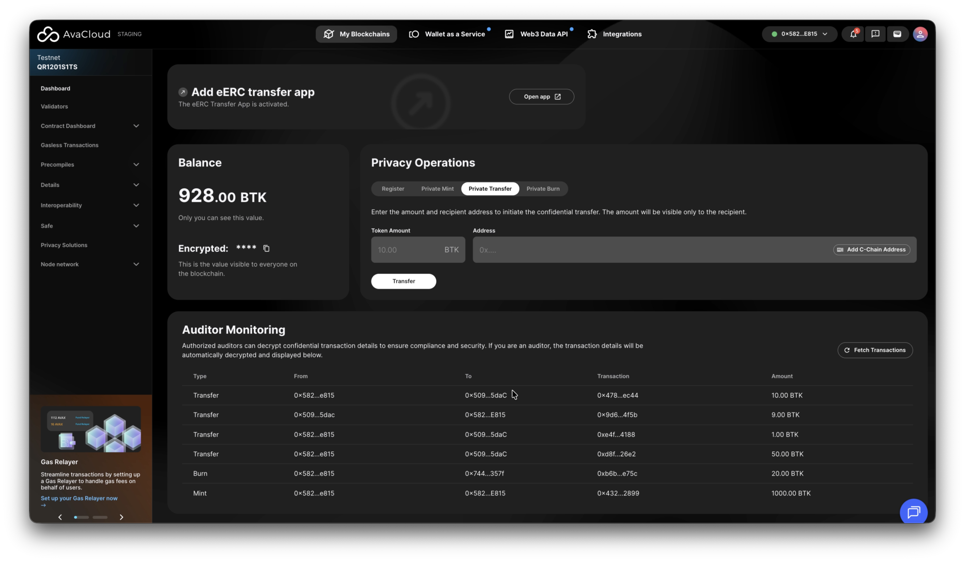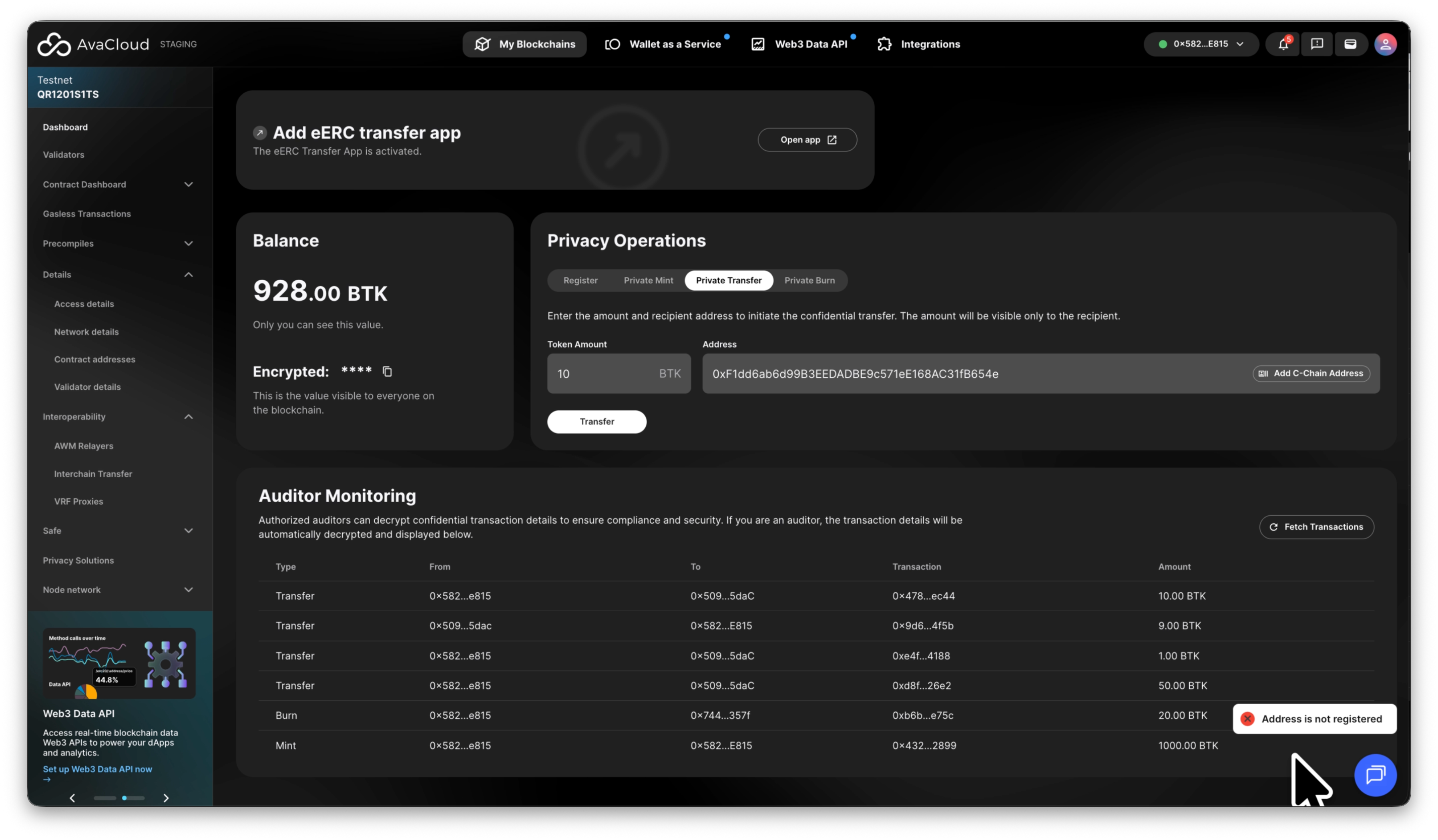 This guide walks you through all supported operations on an Encrypted ERC (eERC) token via the AvaCloud Portal.
