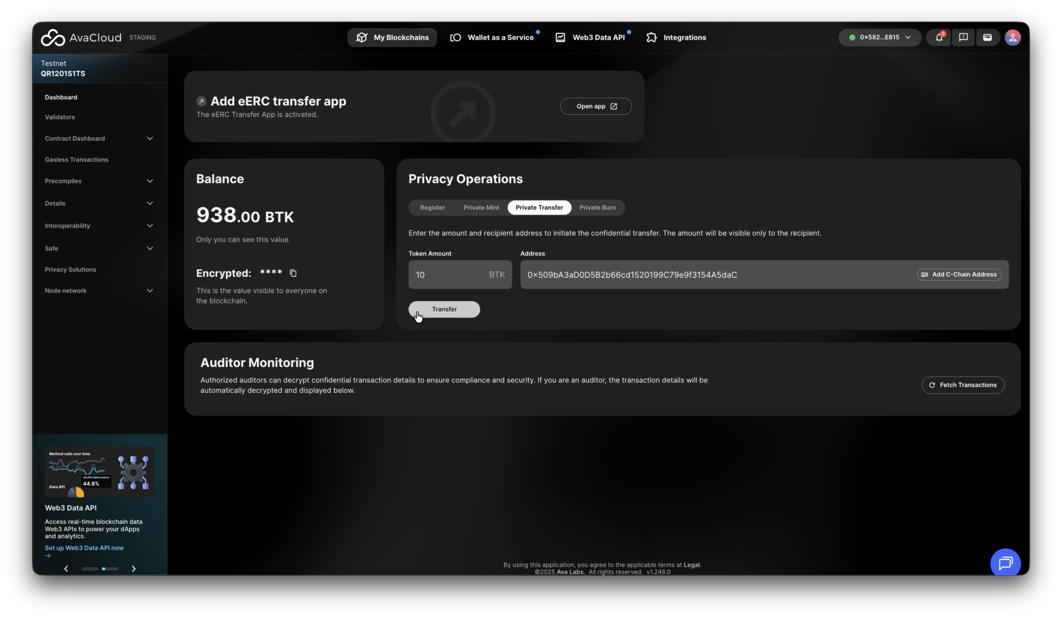 - Click Fetch Transactions under Auditor Monitoring to view recent transactions (visible only if the connected wallet is an auditor).